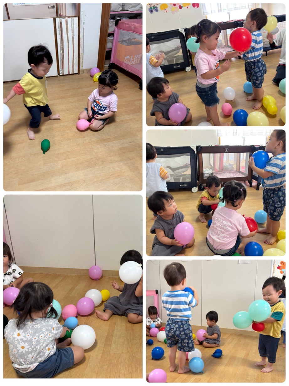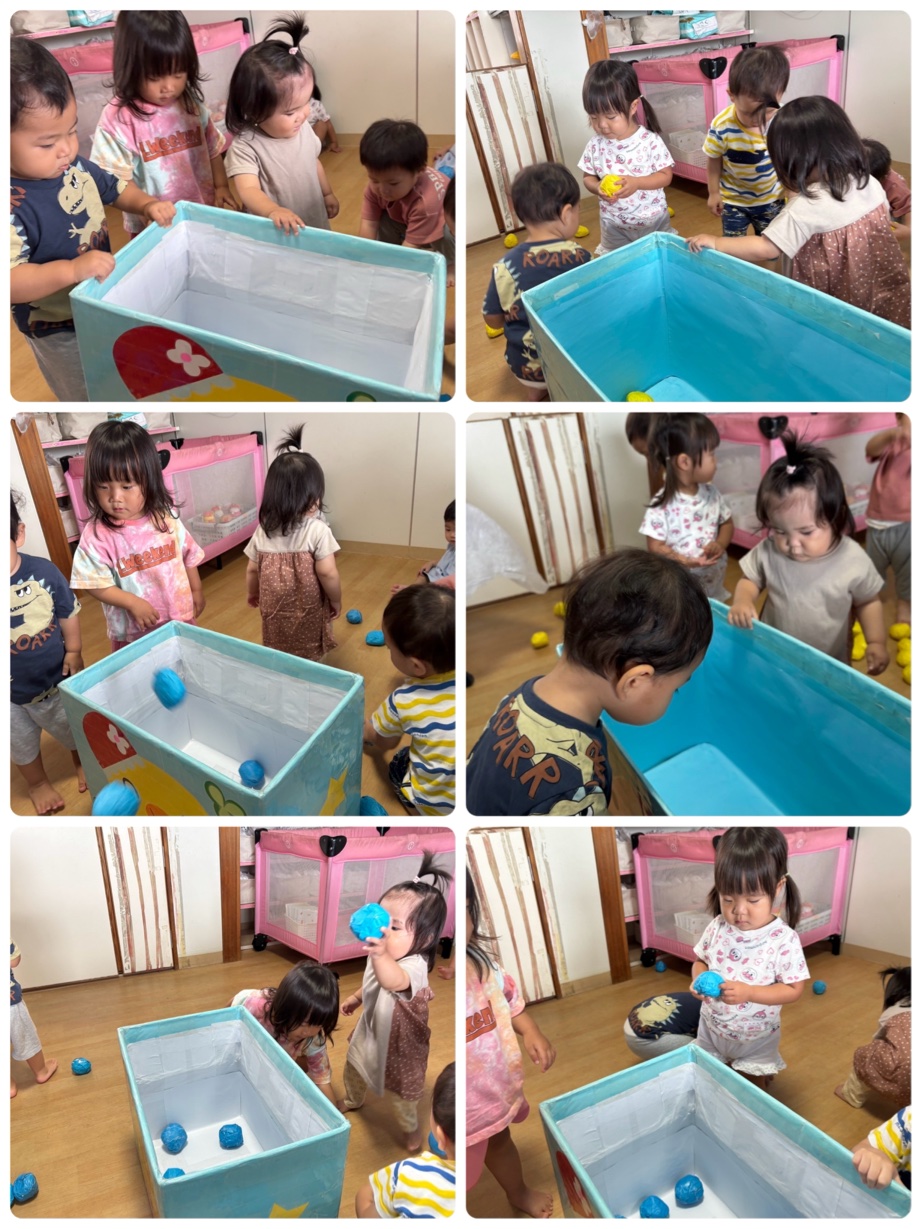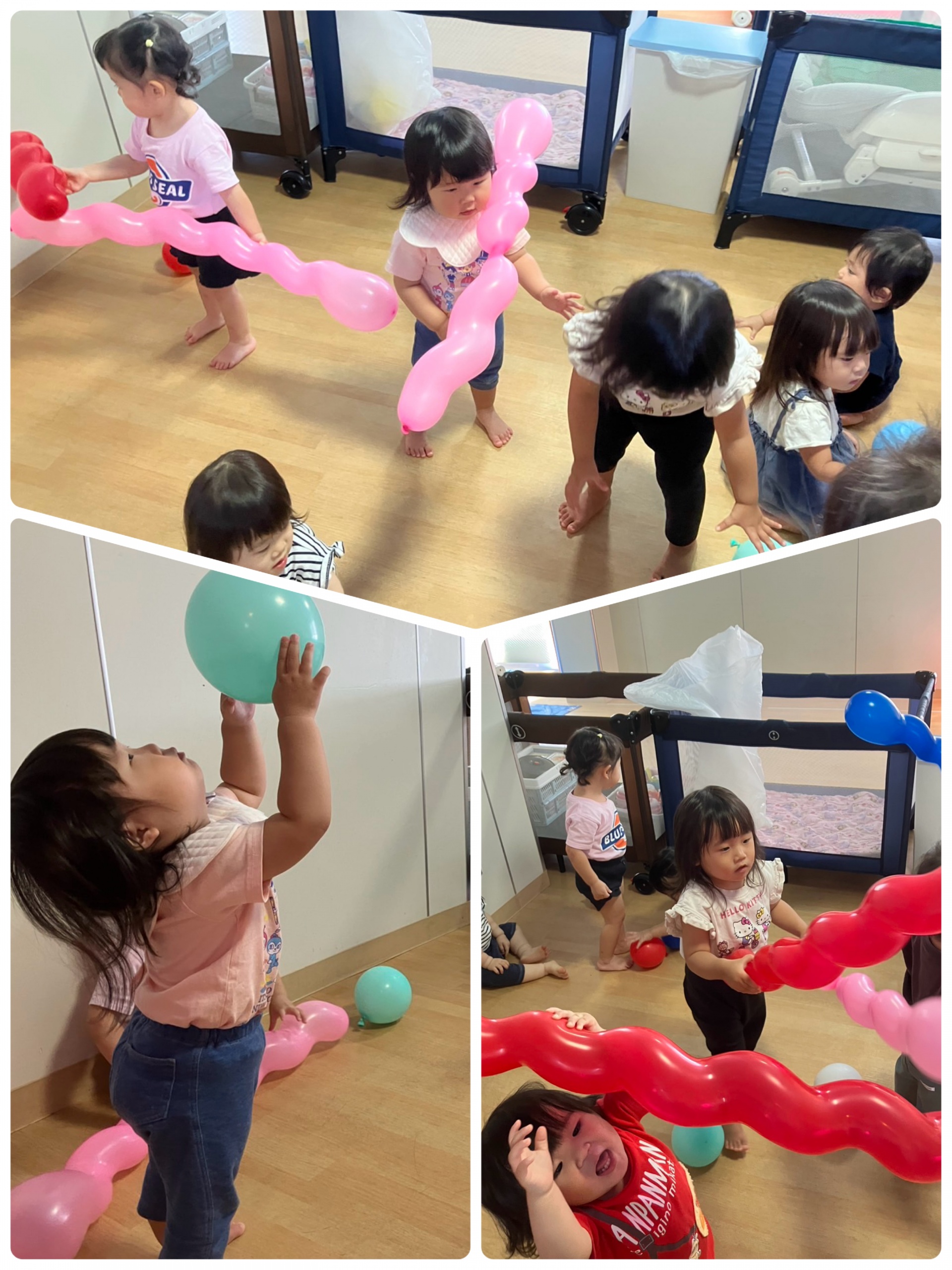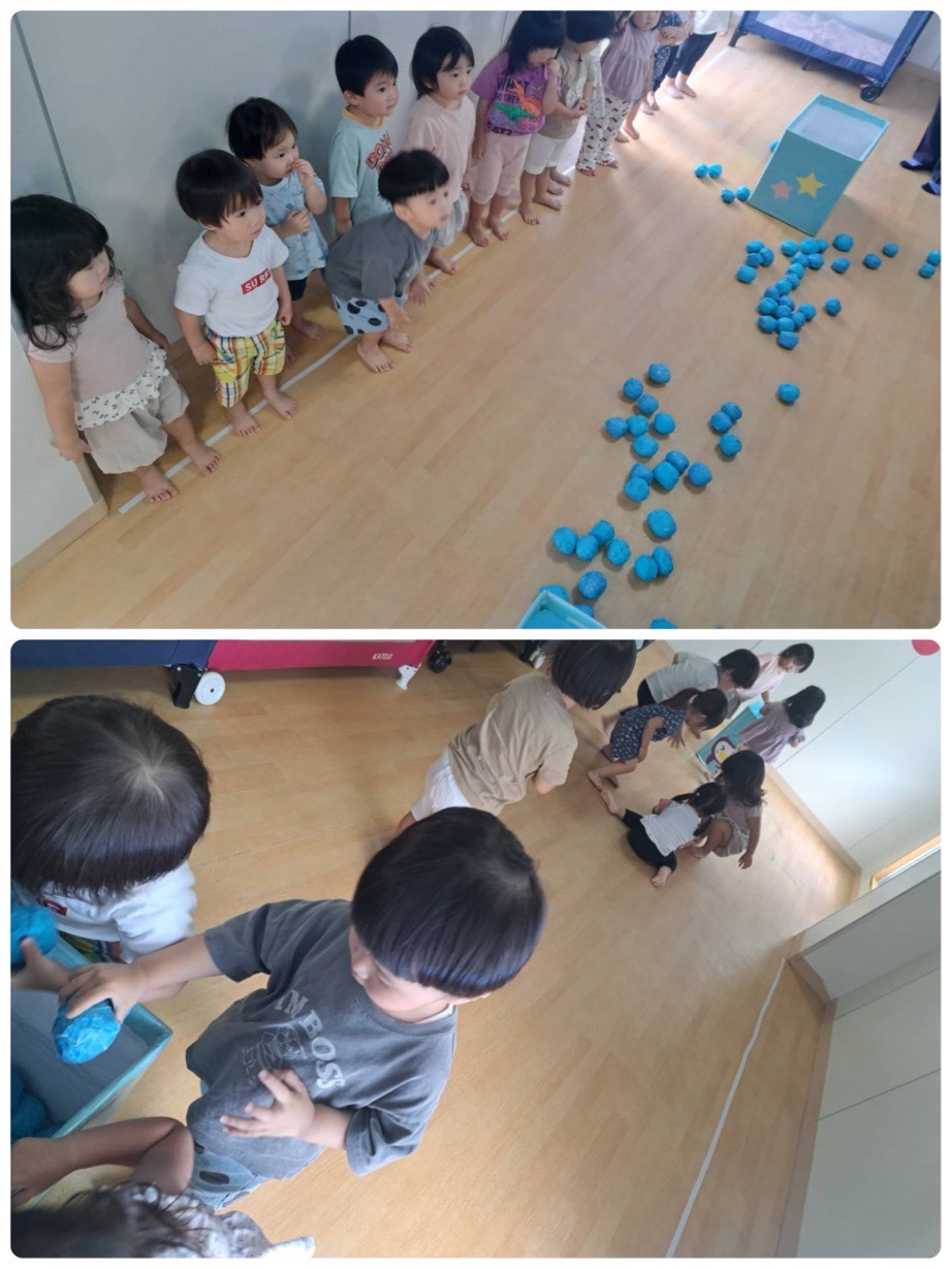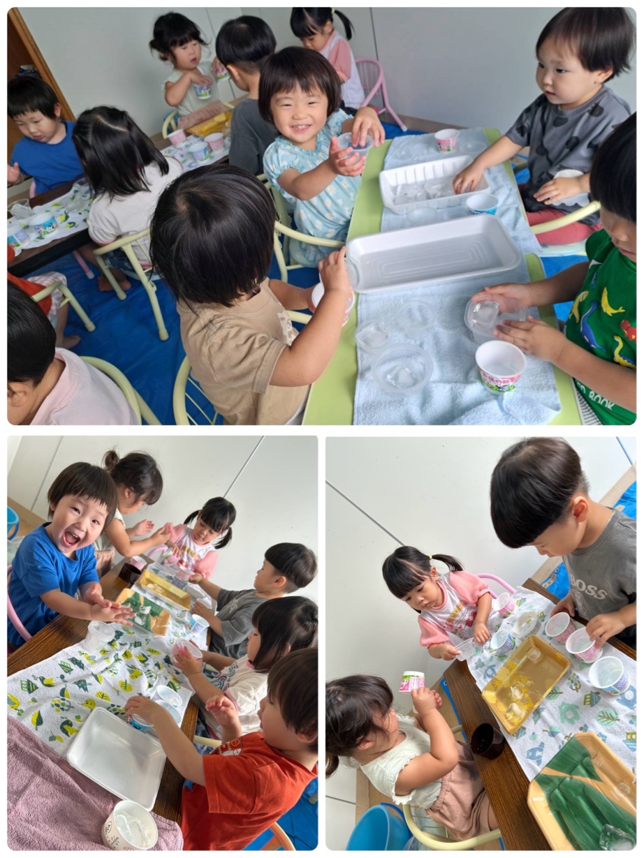 おれんじさん、しろさんは凍らせた水風船を触って感触遊びをしましたよ。冷たい氷を触ると「つめたい♡」と気持ちよさそうに触っていましたよ♪ 水風船を割るところんとした卵のような形の氷が出てきて「たまご〜!」と嬉しそうな子どもたちでした^^*
