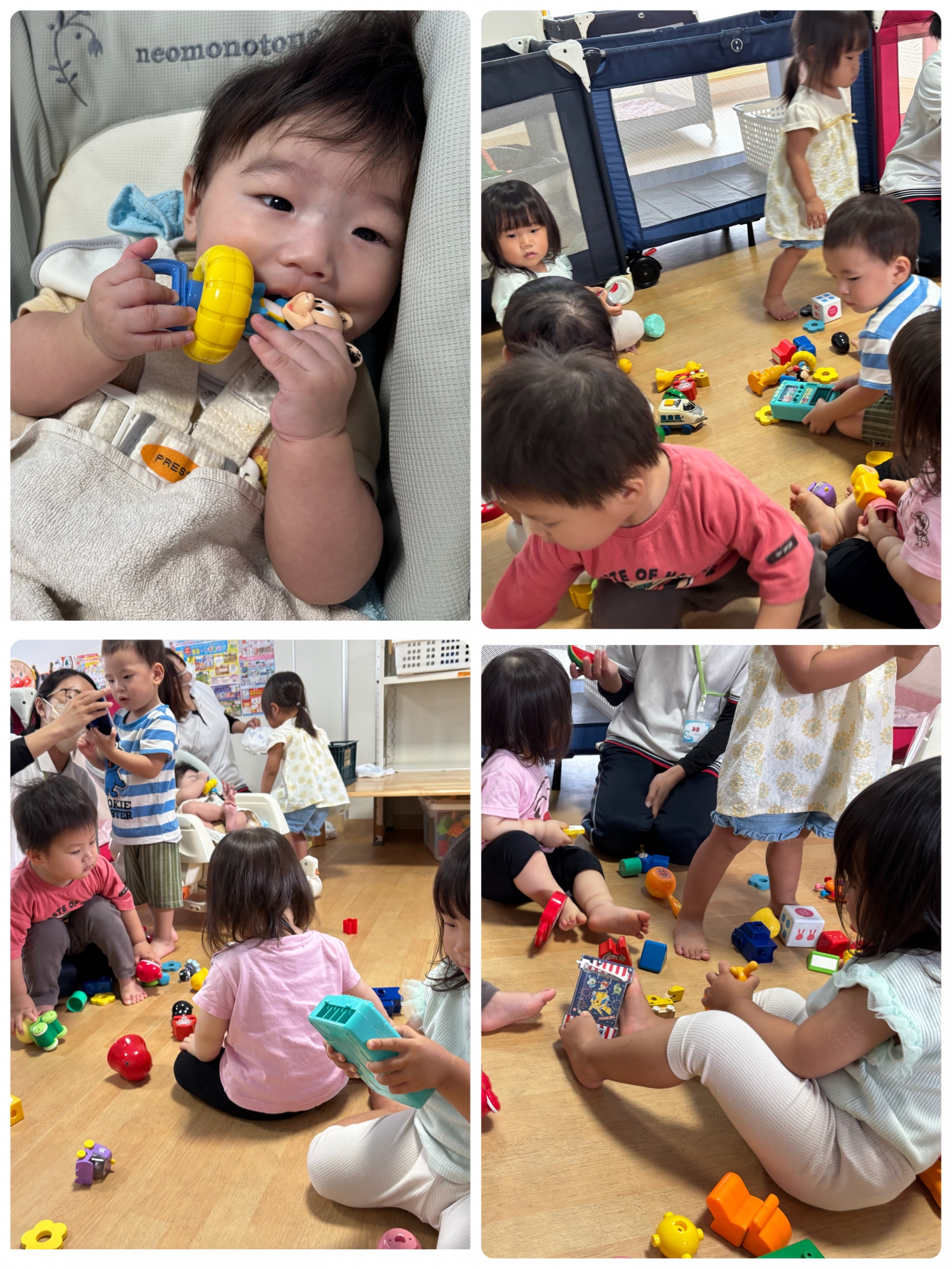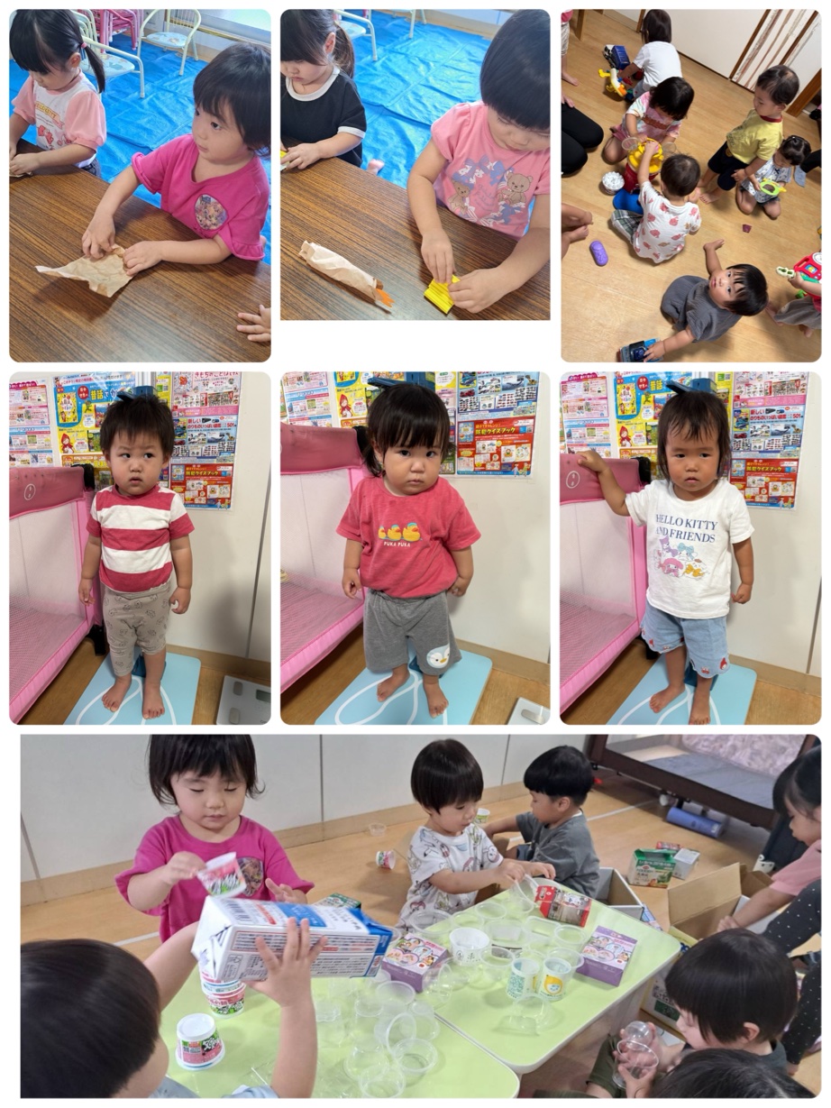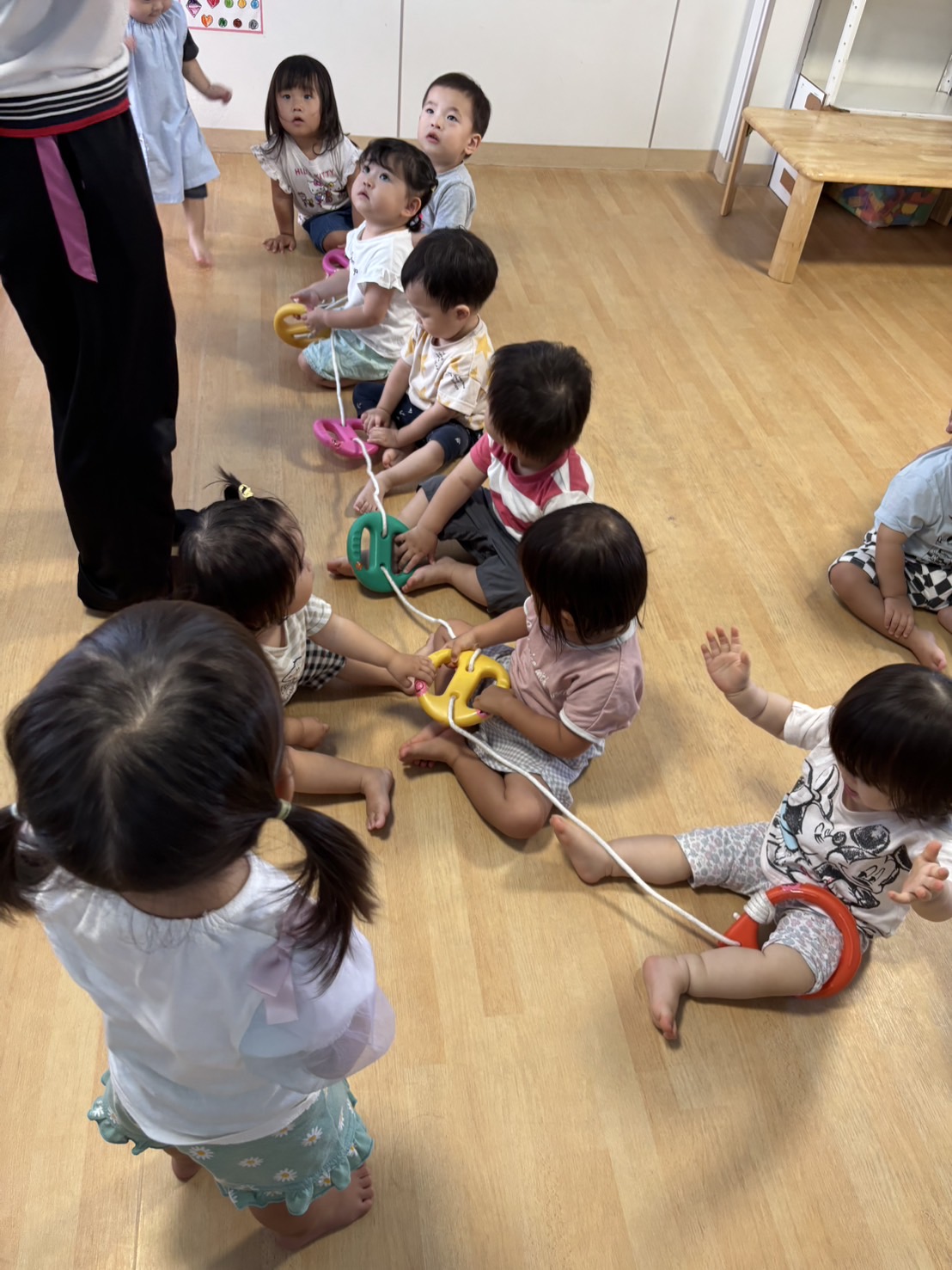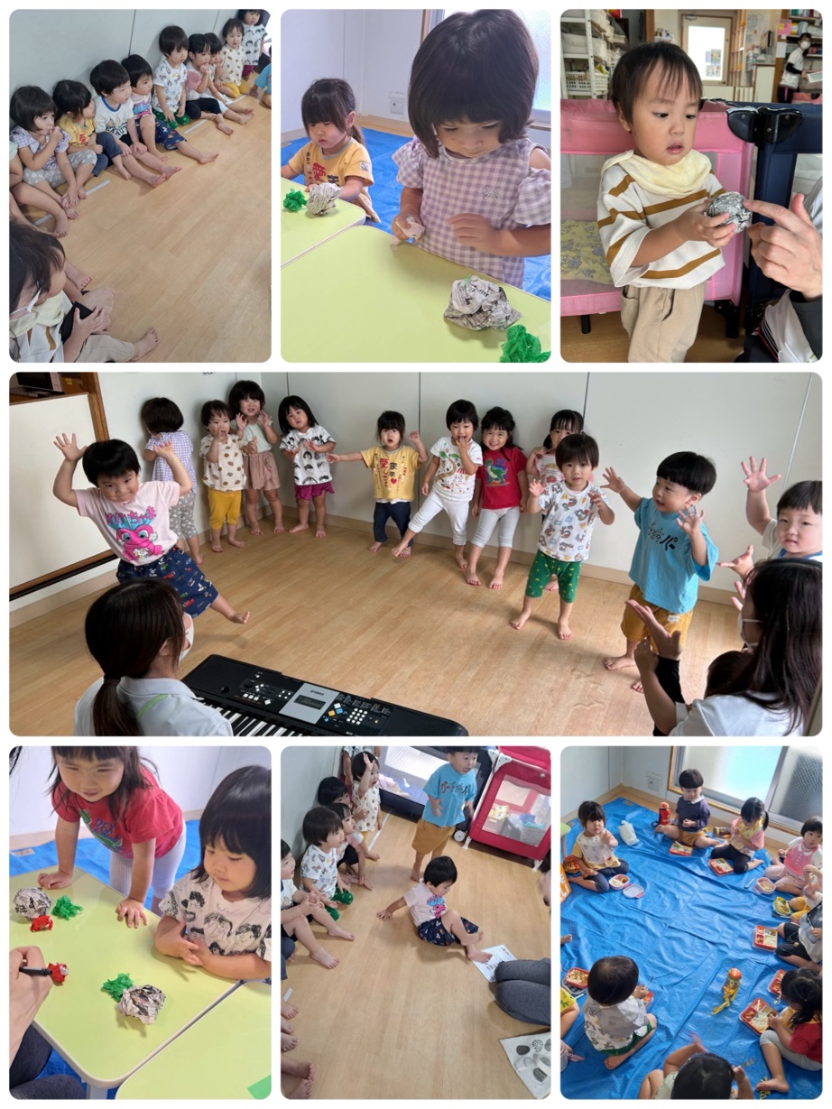 おれんじさん、しろさんは凍らせた水風船を触って感触遊びをしましたよ。冷たい氷を触ると「つめたい♡」と気持ちよさそうに触っていましたよ♪ 水風船を割るところんとした卵のような形の氷が出てきて「たまご〜!」と嬉しそうな子どもたちでした^^*