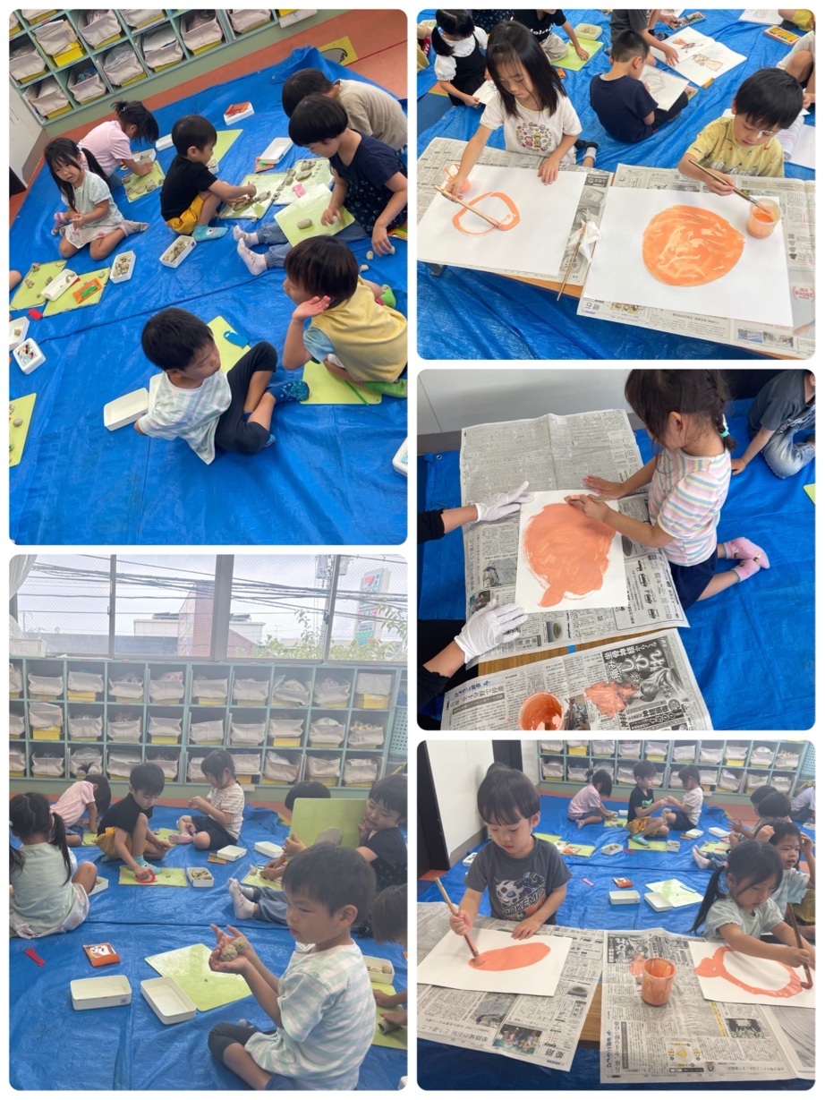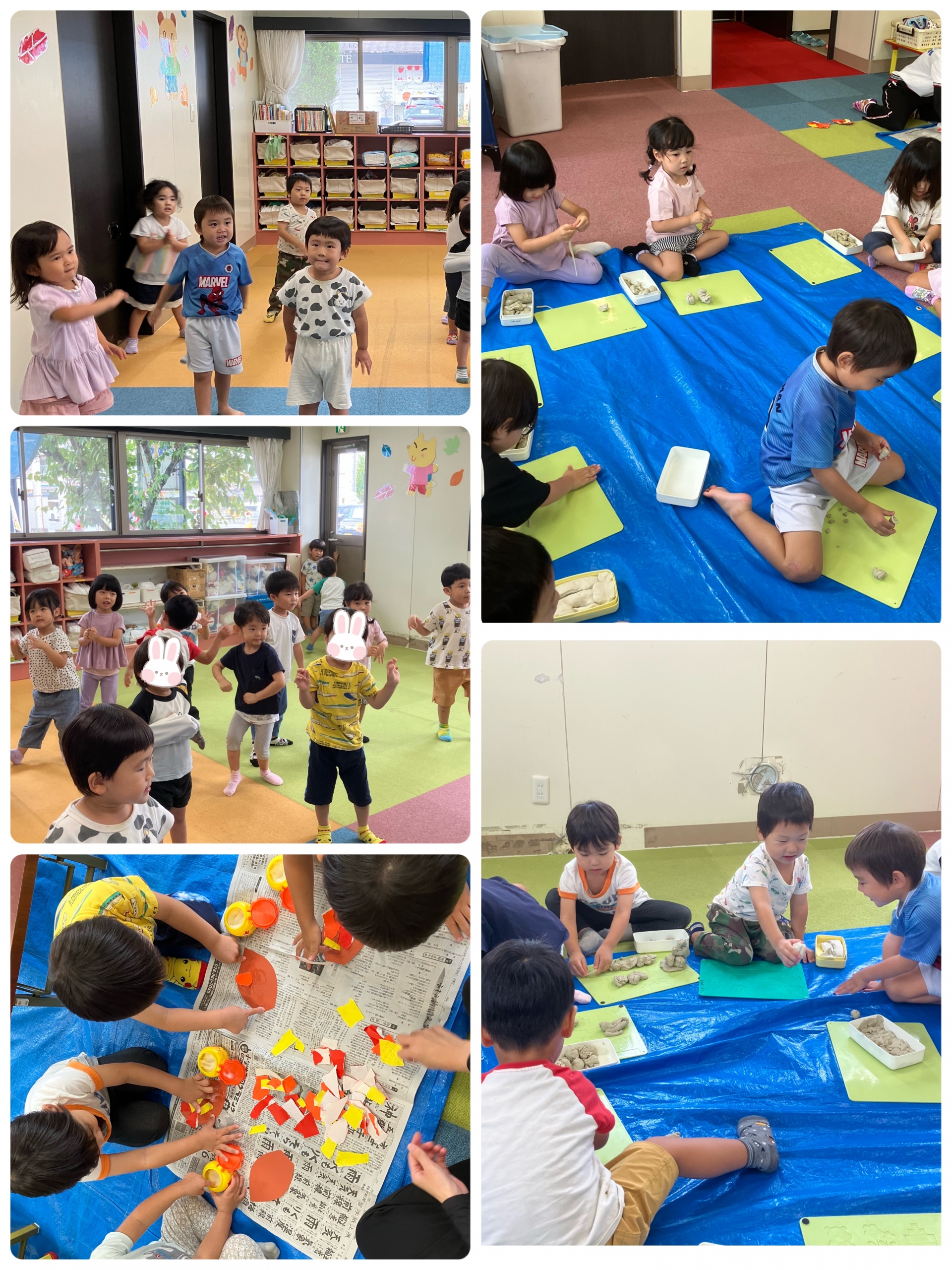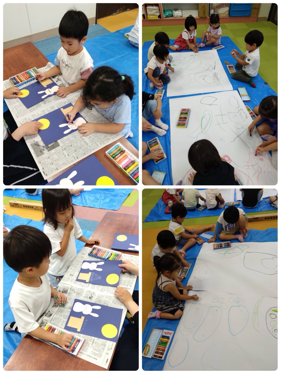 今日はくじらさん、きいろぺんぎんさんは製作をしました。絵の具を使って絵を描くことを楽しんだくじらさん。お月見の製作をしたり、大きな紙に絵を描くことを楽しんだきいろぺんぎんさん。どのクラスも自分のイメージを楽しんで表現しています。