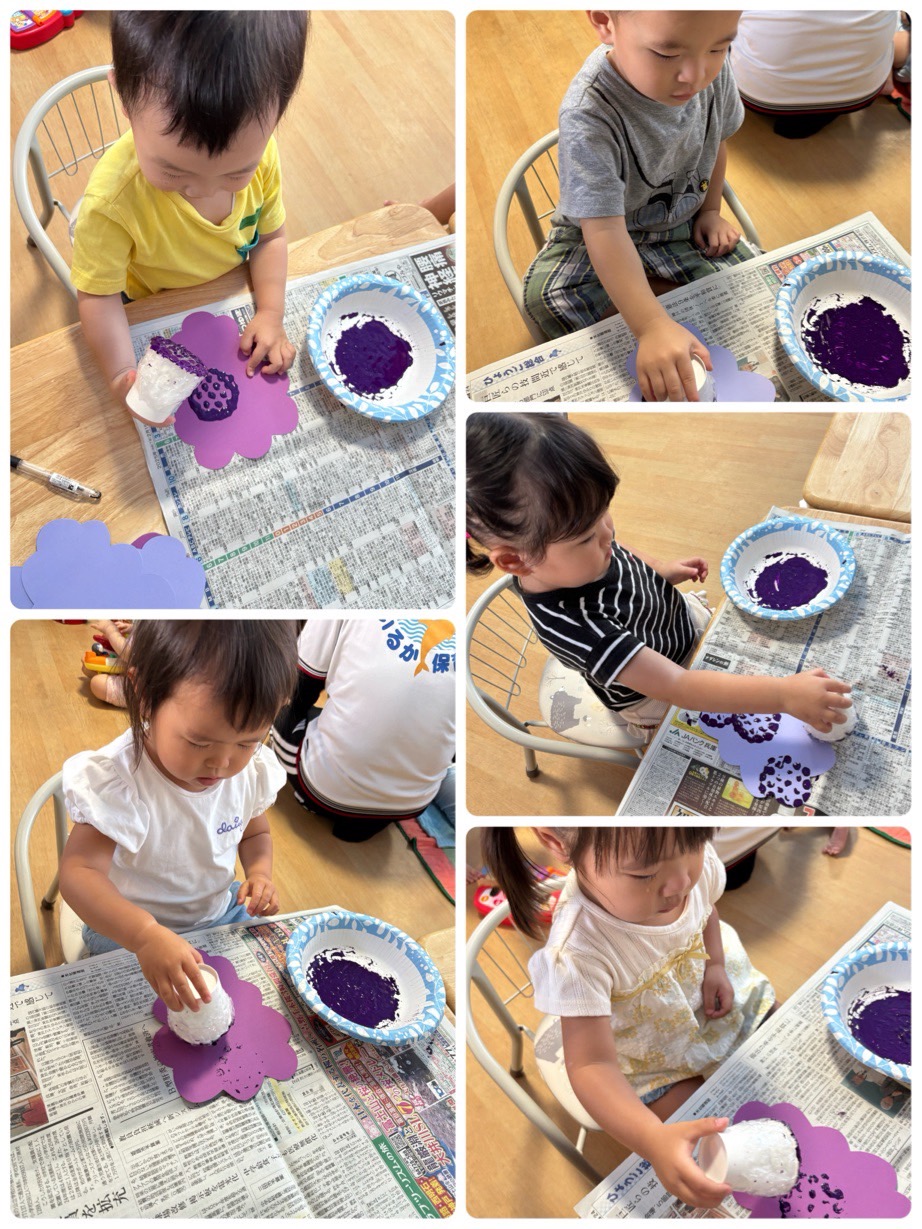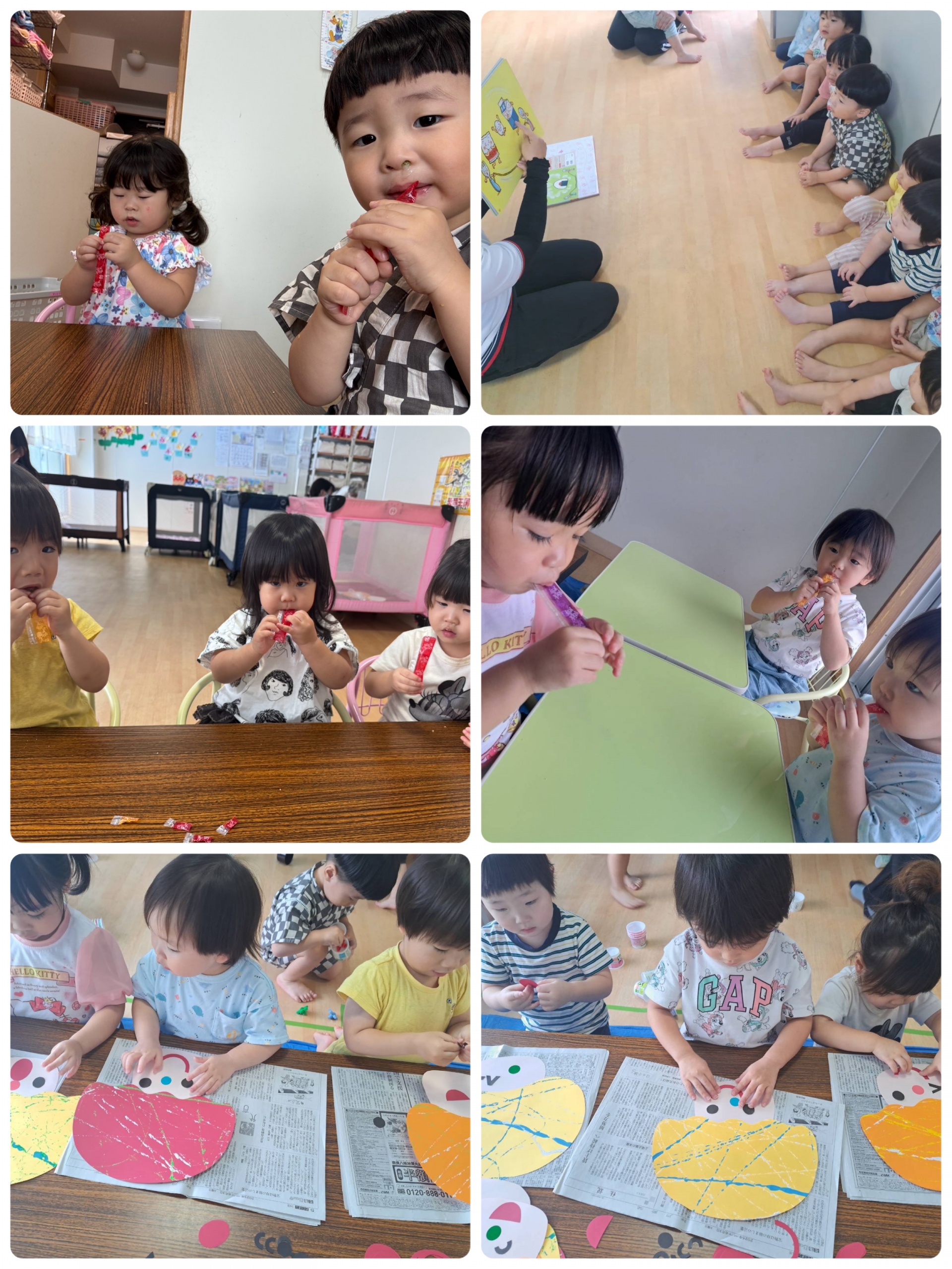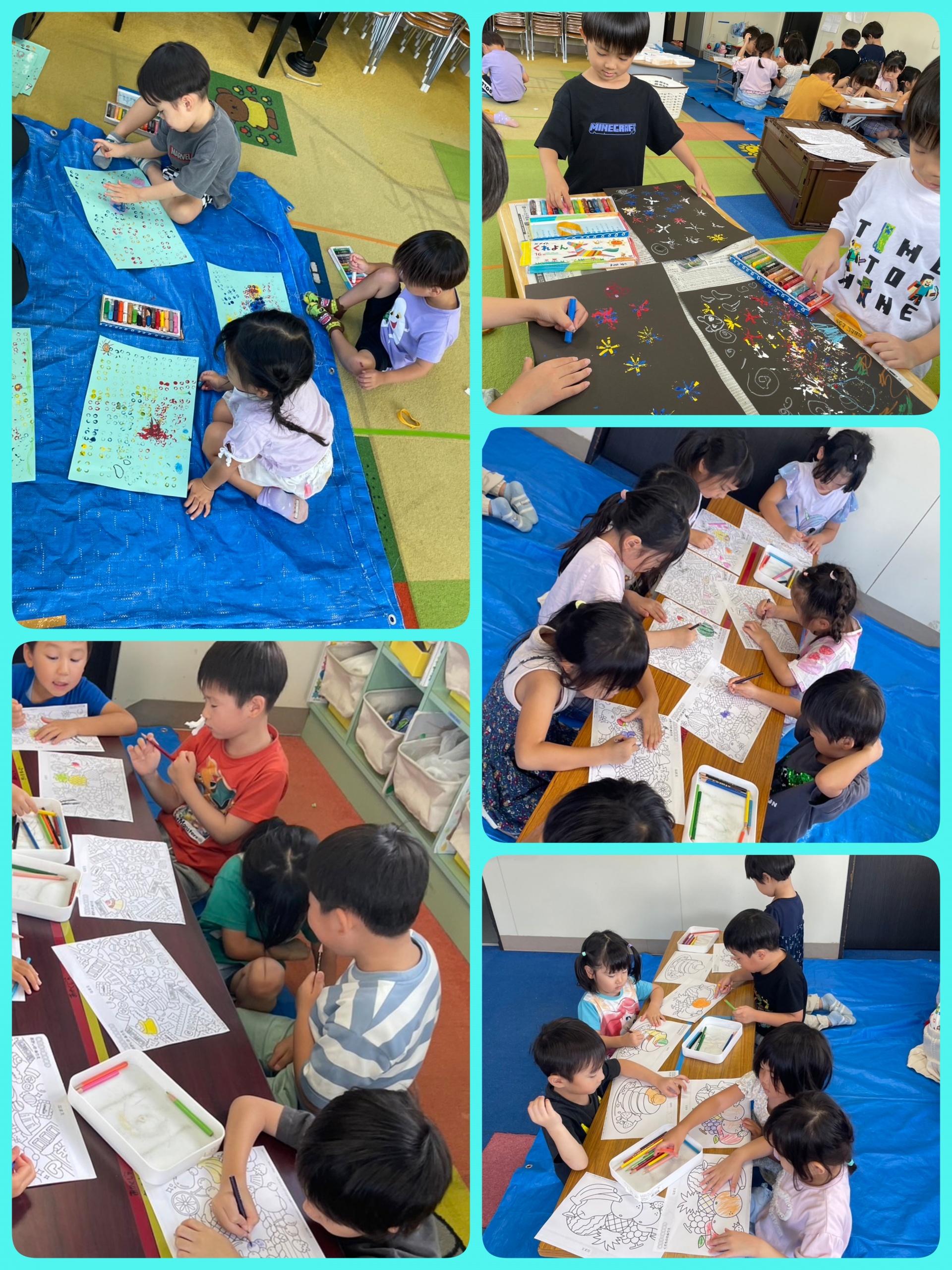 今日はくじらさん、きいろぺんぎんさんは製作をしました。絵の具を使って絵を描くことを楽しんだくじらさん。お月見の製作をしたり、大きな紙に絵を描くことを楽しんだきいろぺんぎんさん。どのクラスも自分のイメージを楽しんで表現しています。