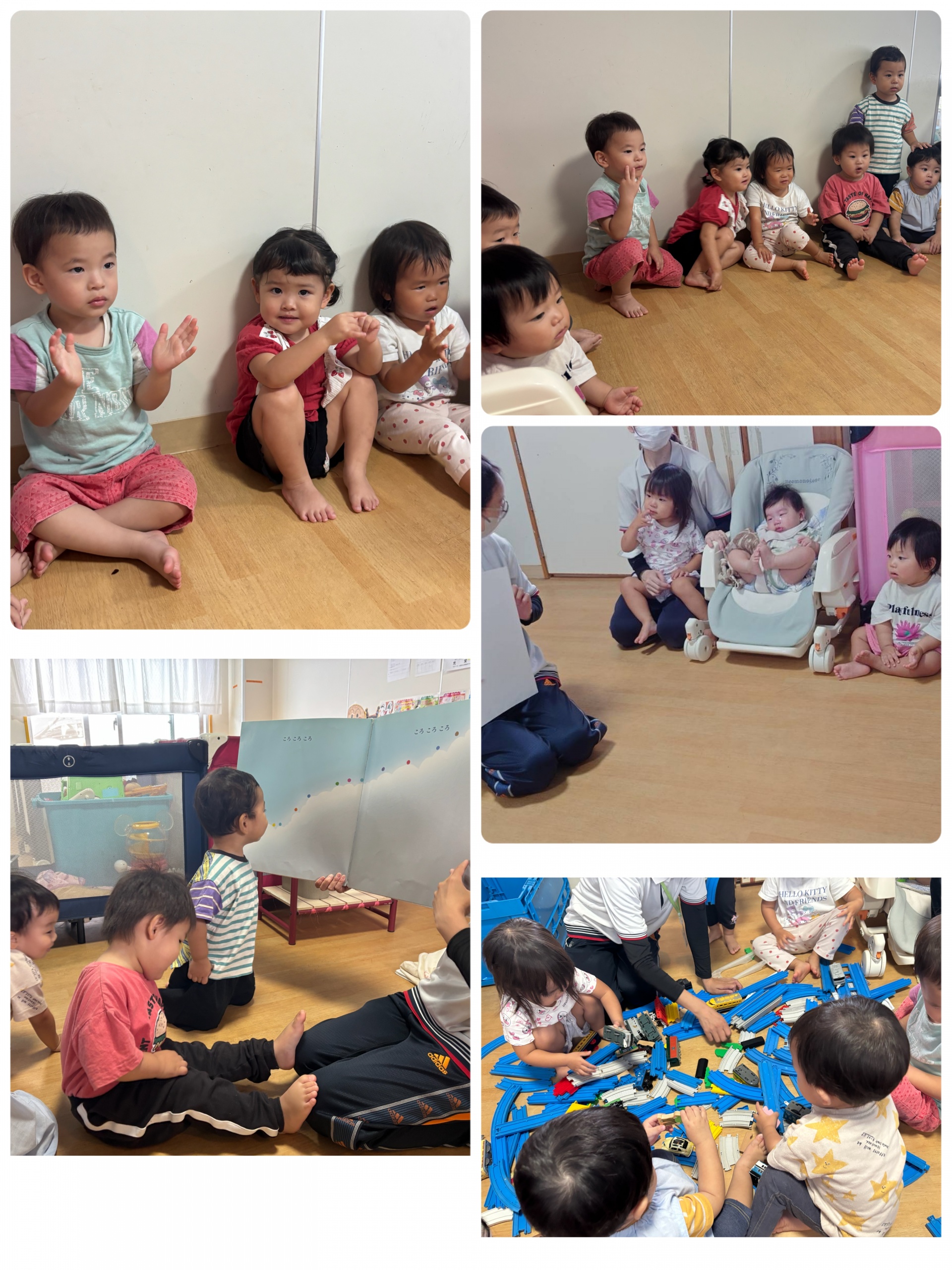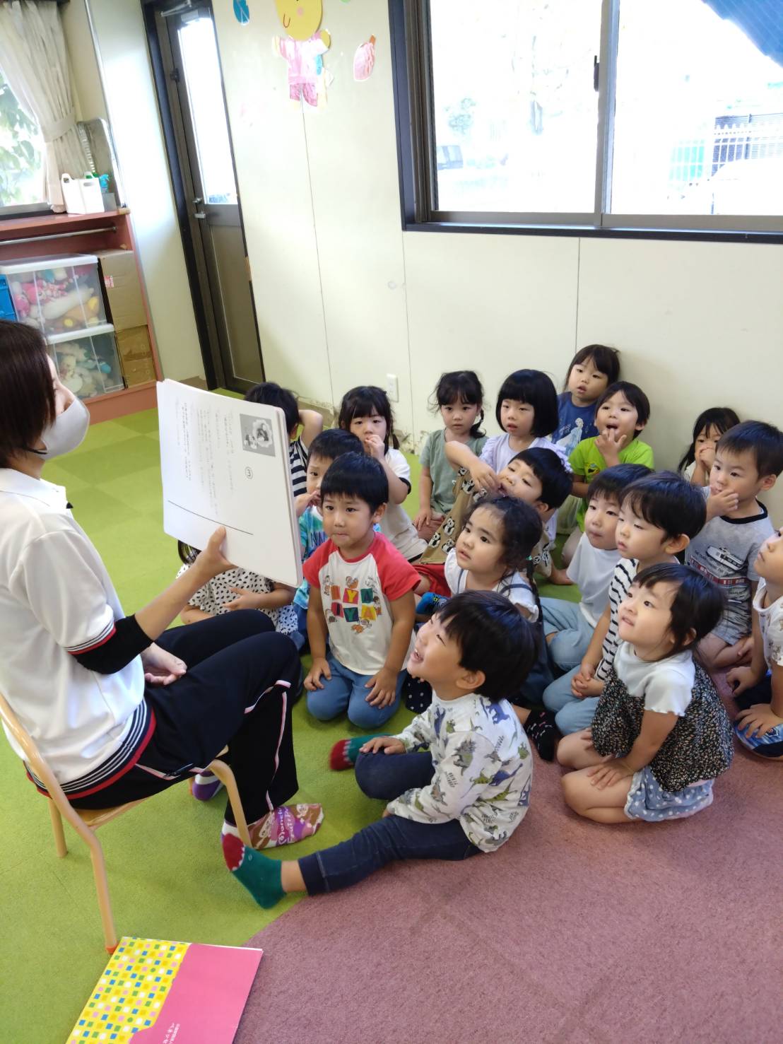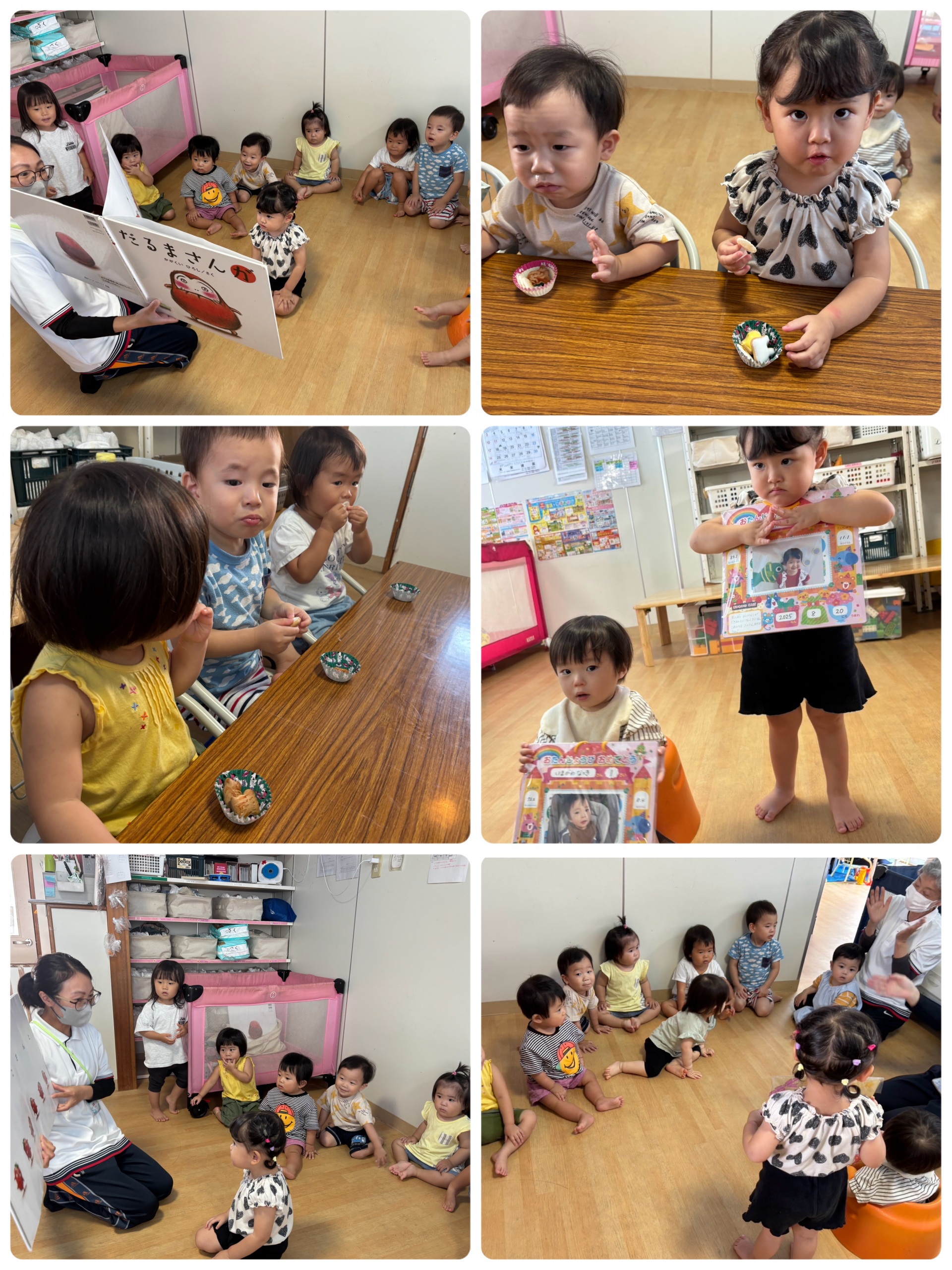 分園おれんじさん、しろさん、みどりさんではおやつを食べてから、大形絵本を見ましたよ♪ 「だるまさんの」「ころころころ」の2冊を興味津々で見ていた子どもたちでしたよ(*ˊˋ*)