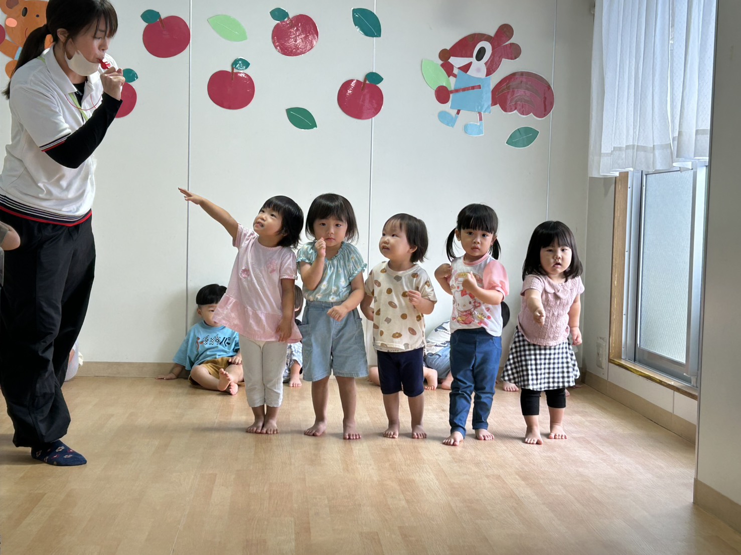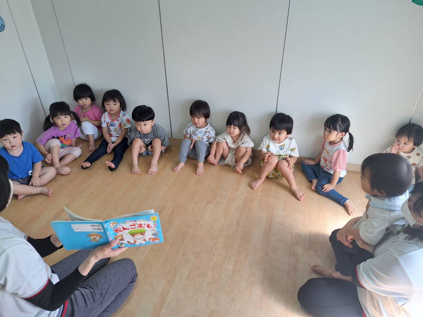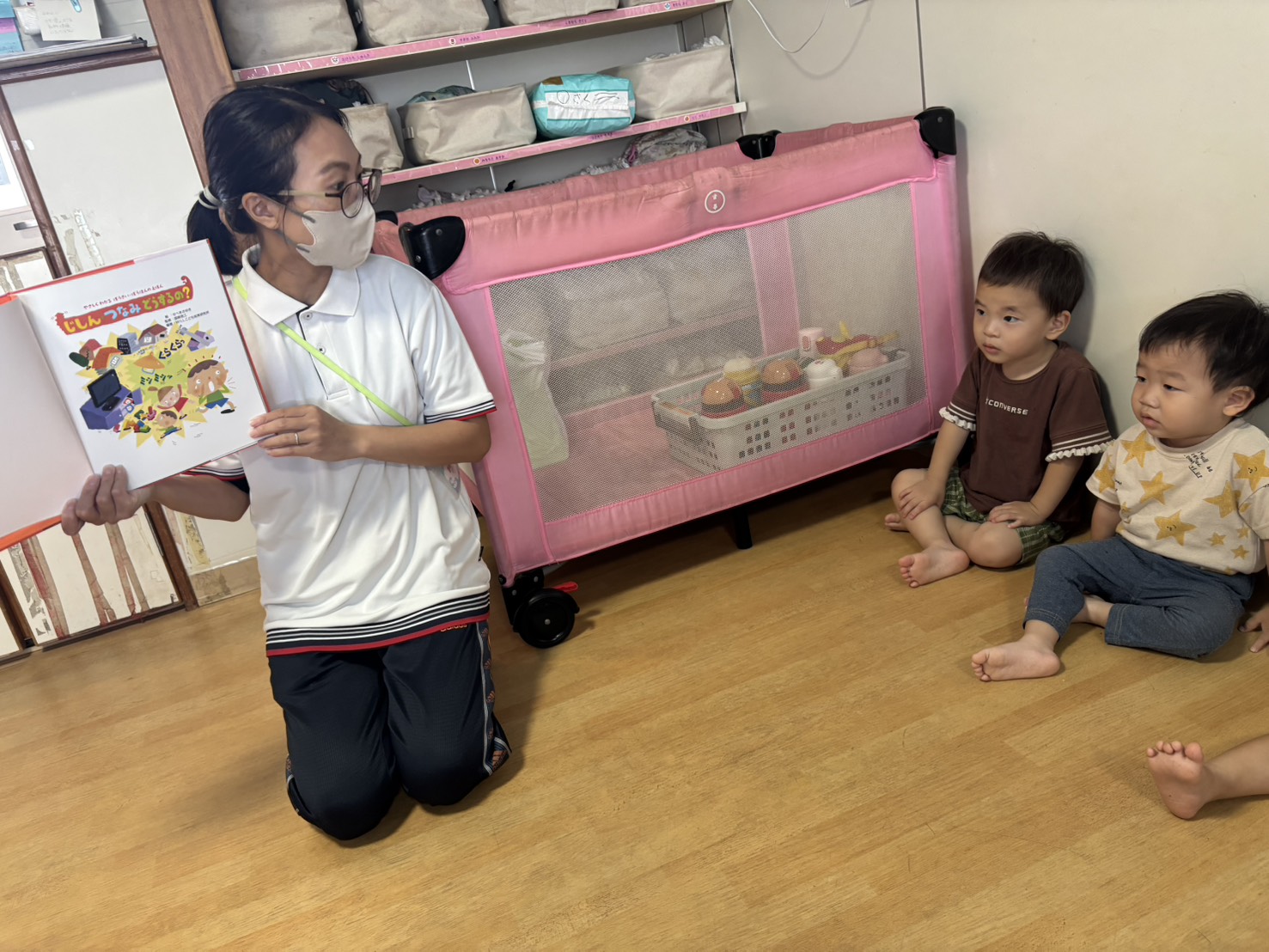 分園おれんじさん、しろさん、みどりさんではおやつを食べてから、大形絵本を見ましたよ♪ 「だるまさんの」「ころころころ」の2冊を興味津々で見ていた子どもたちでしたよ(*ˊˋ*)
