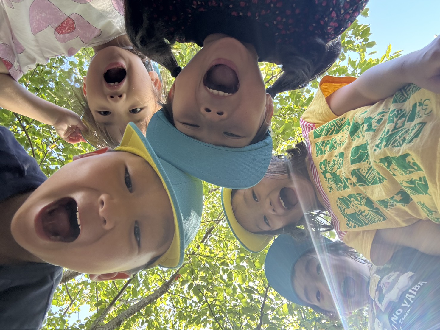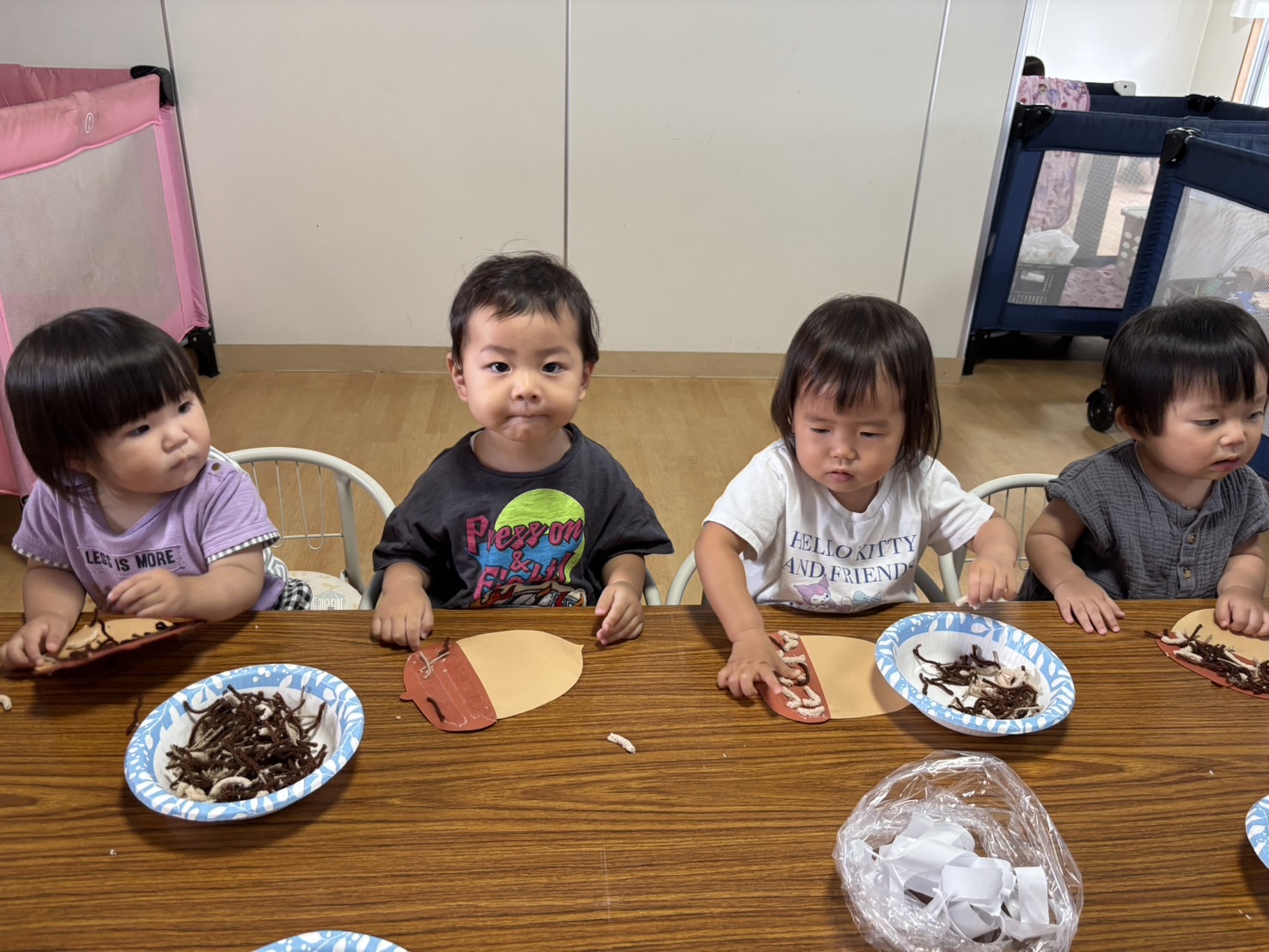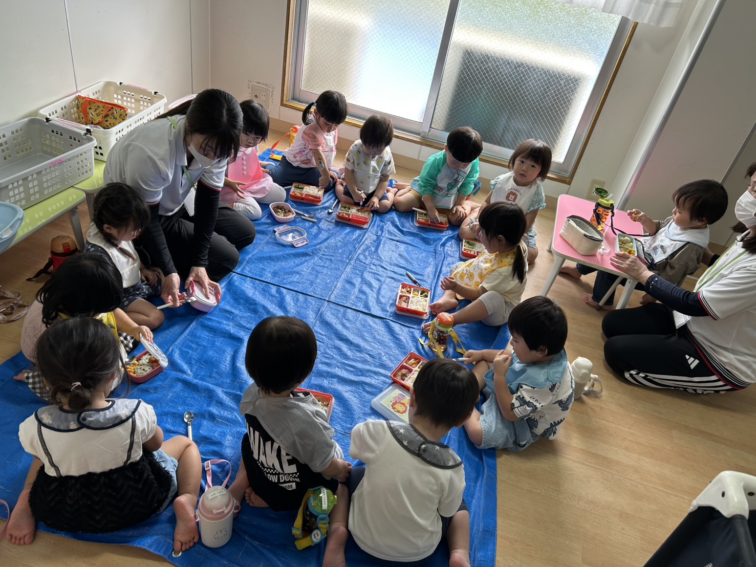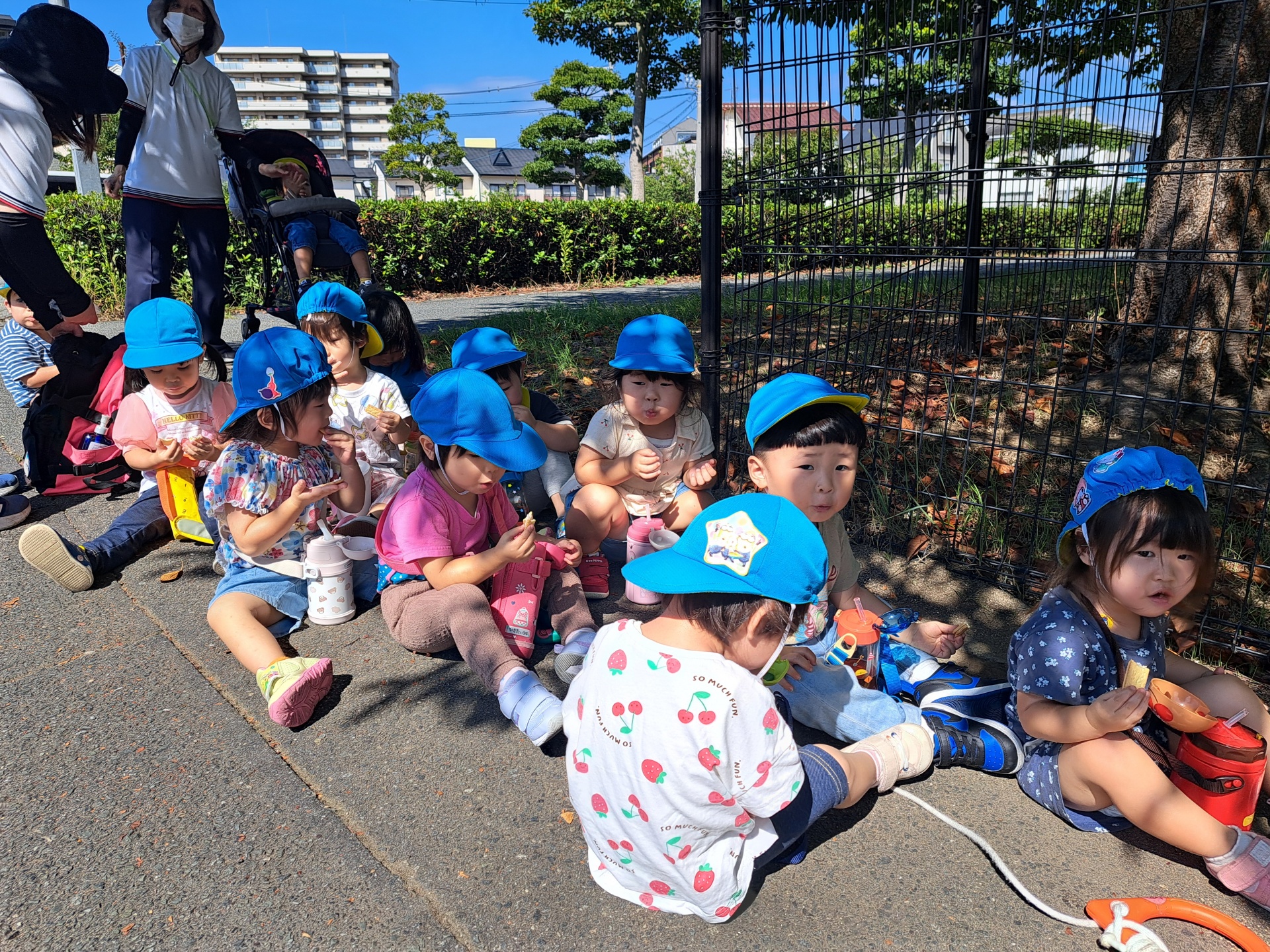 お外でみんなでおやつを食べると特別感があって、よりおいしく感じますね☆ 子どもたちもにっこりです♡