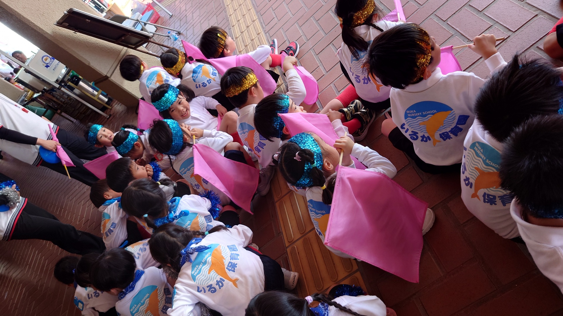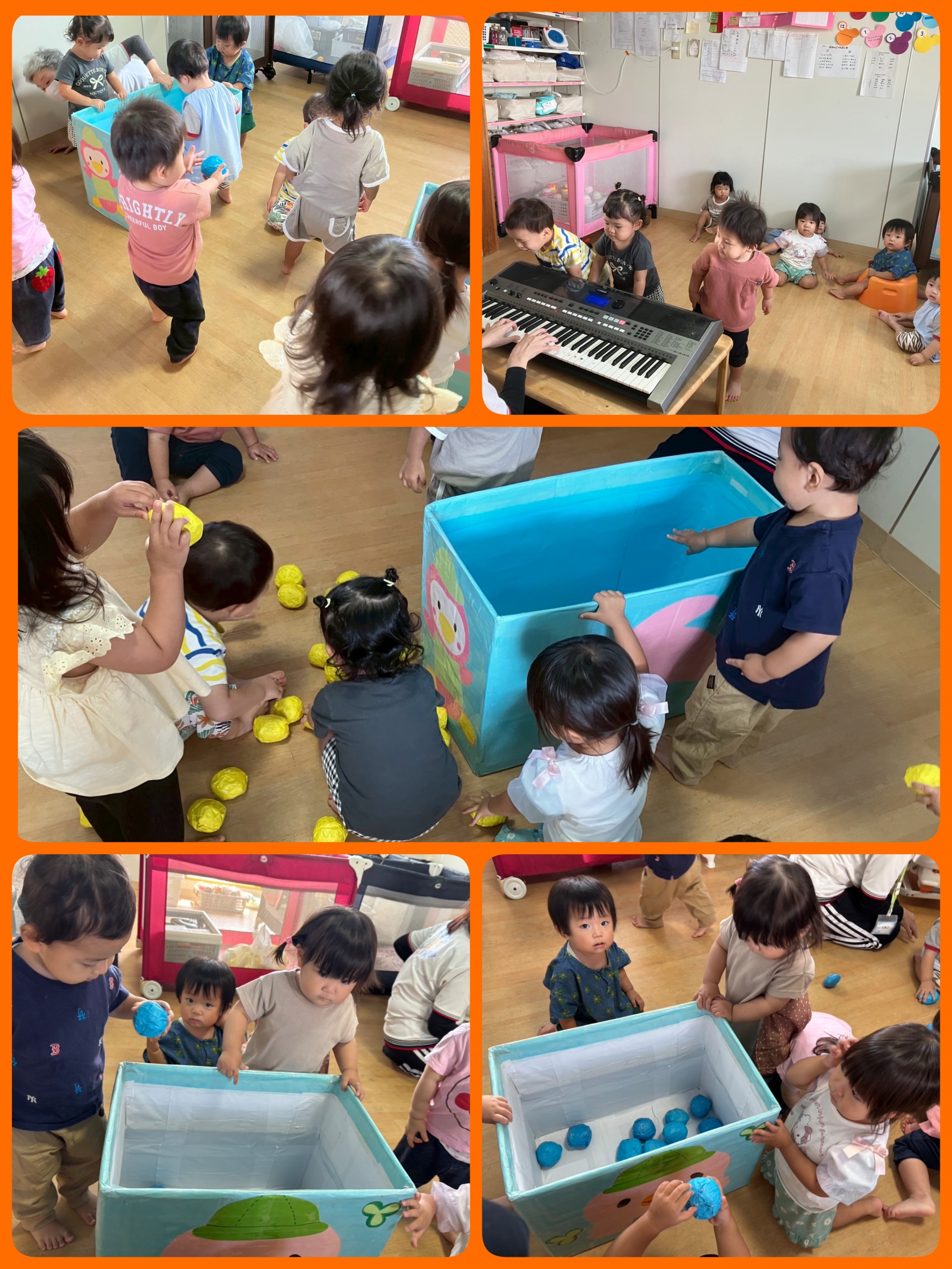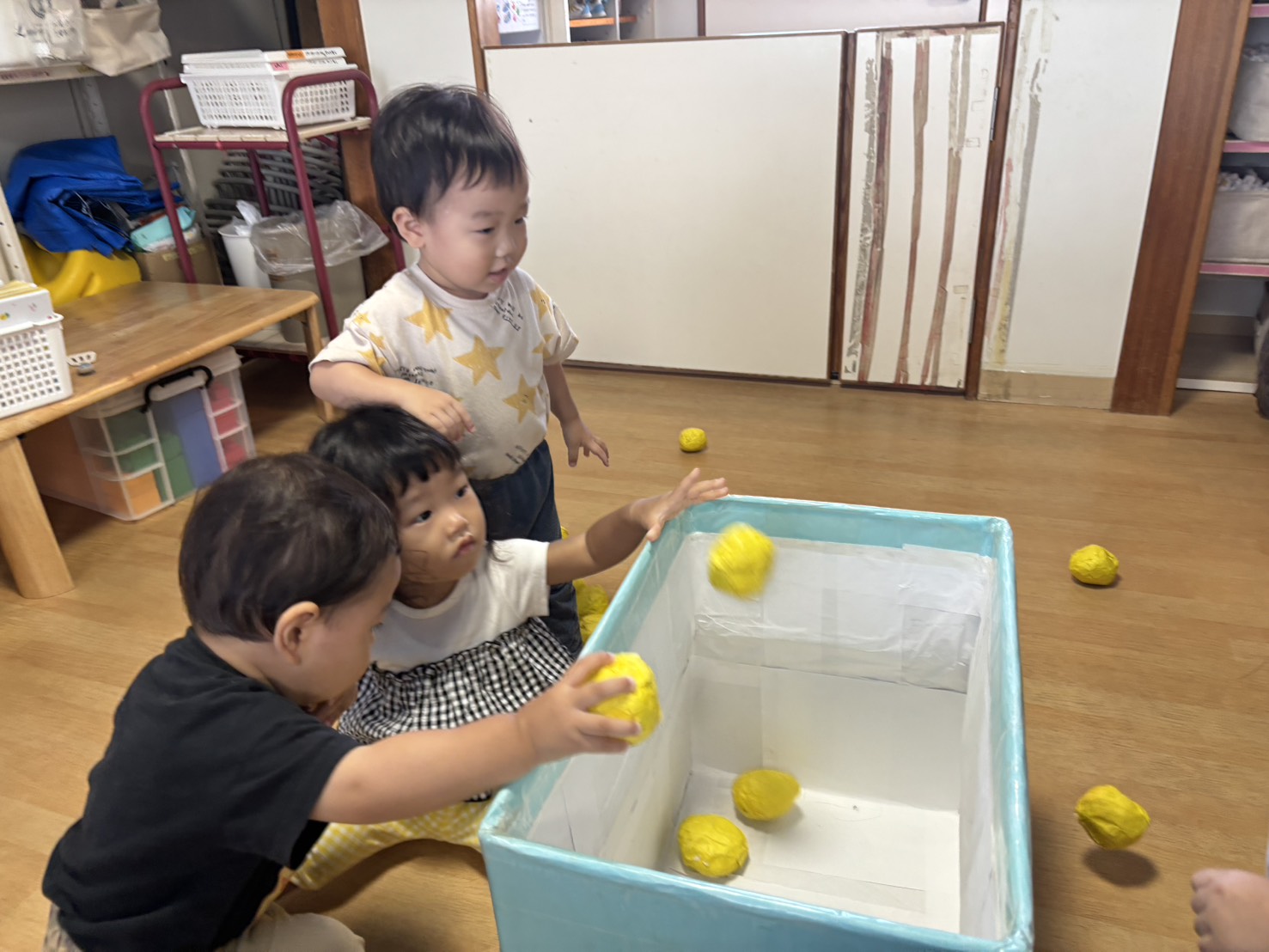 おれんじぺんぎんさんは運動会の玉入れ「ひろってぽん」をしました。一生懸命玉を箱に入れて楽しむ姿が見られましたよ。