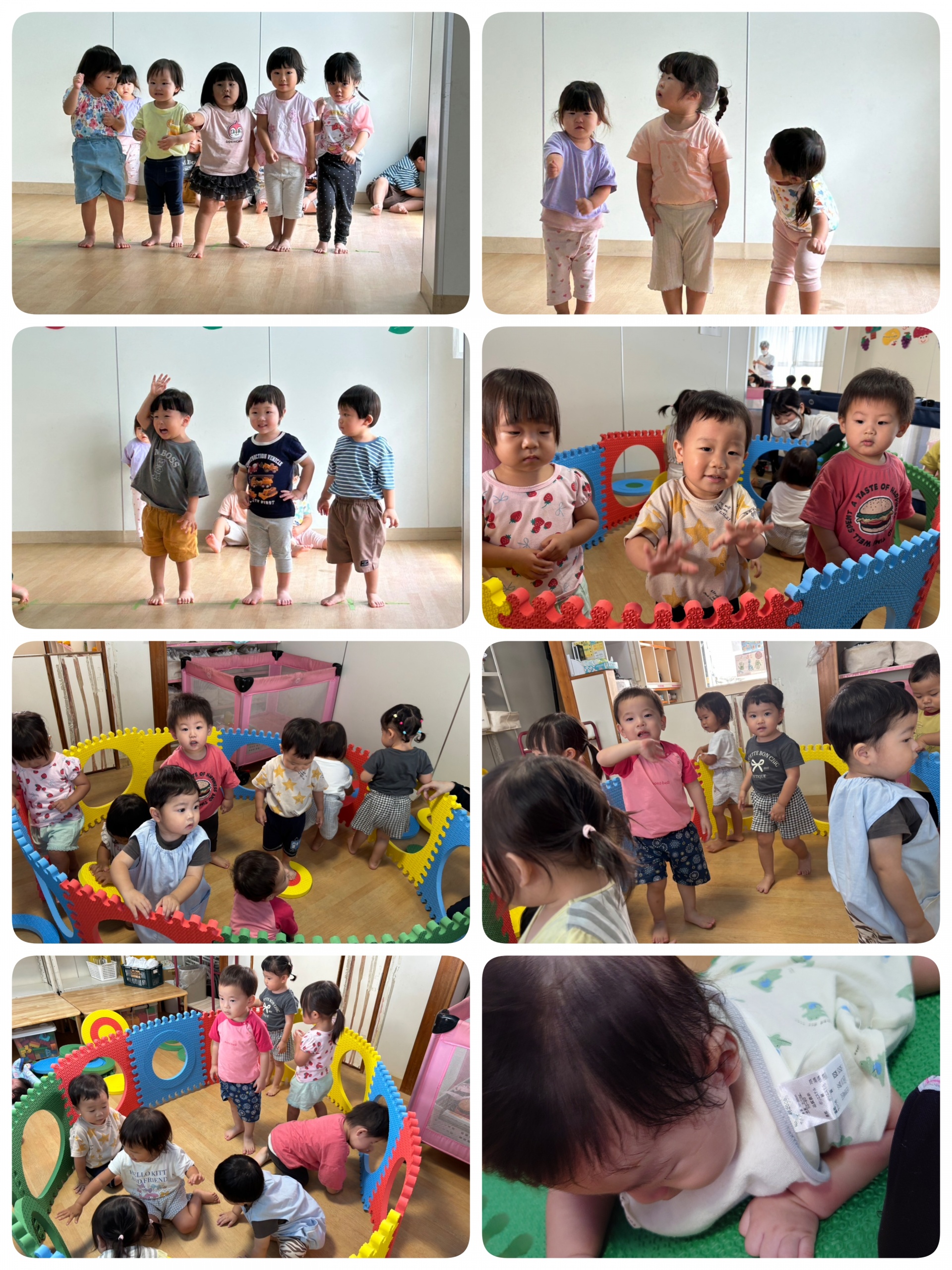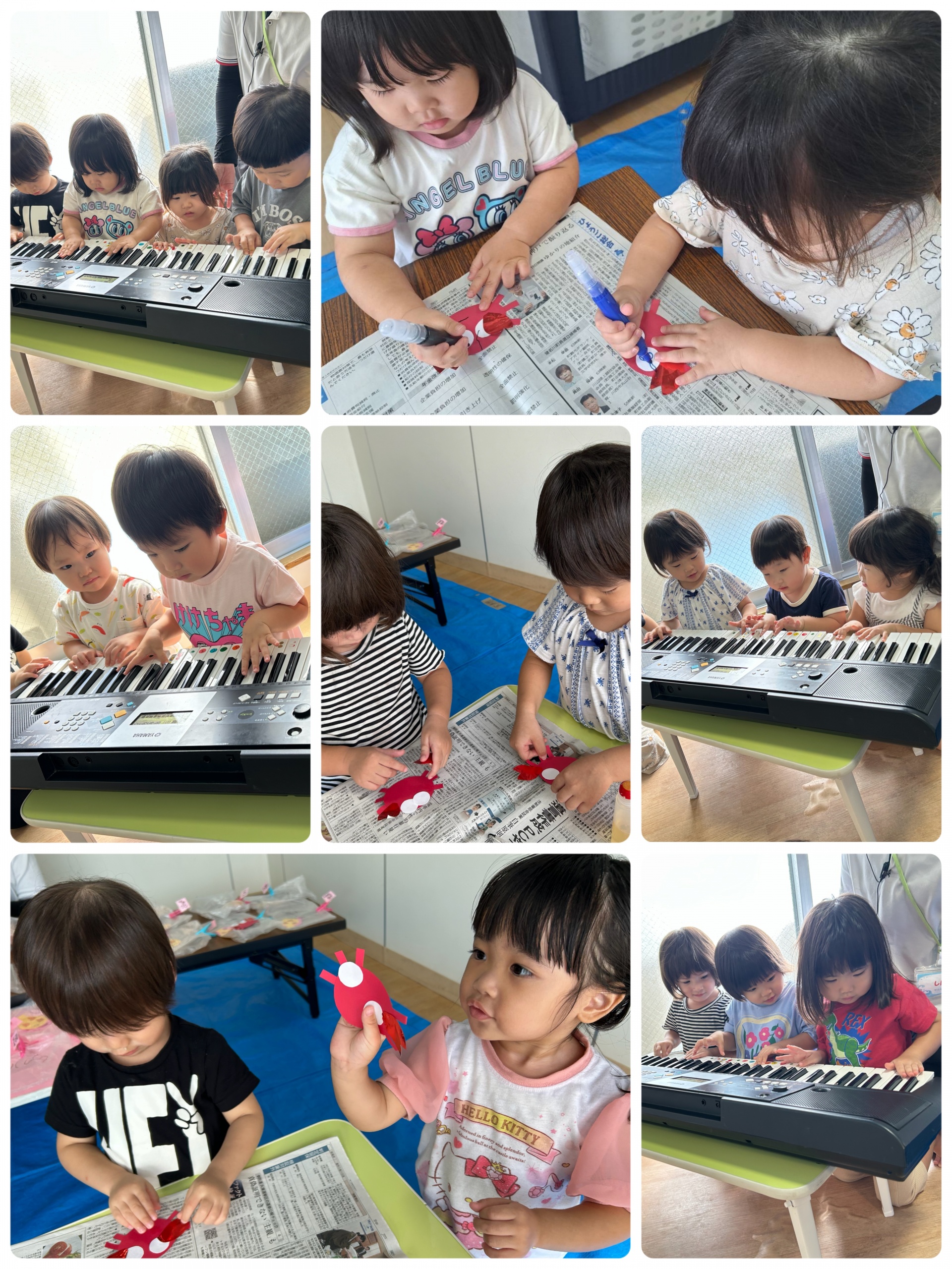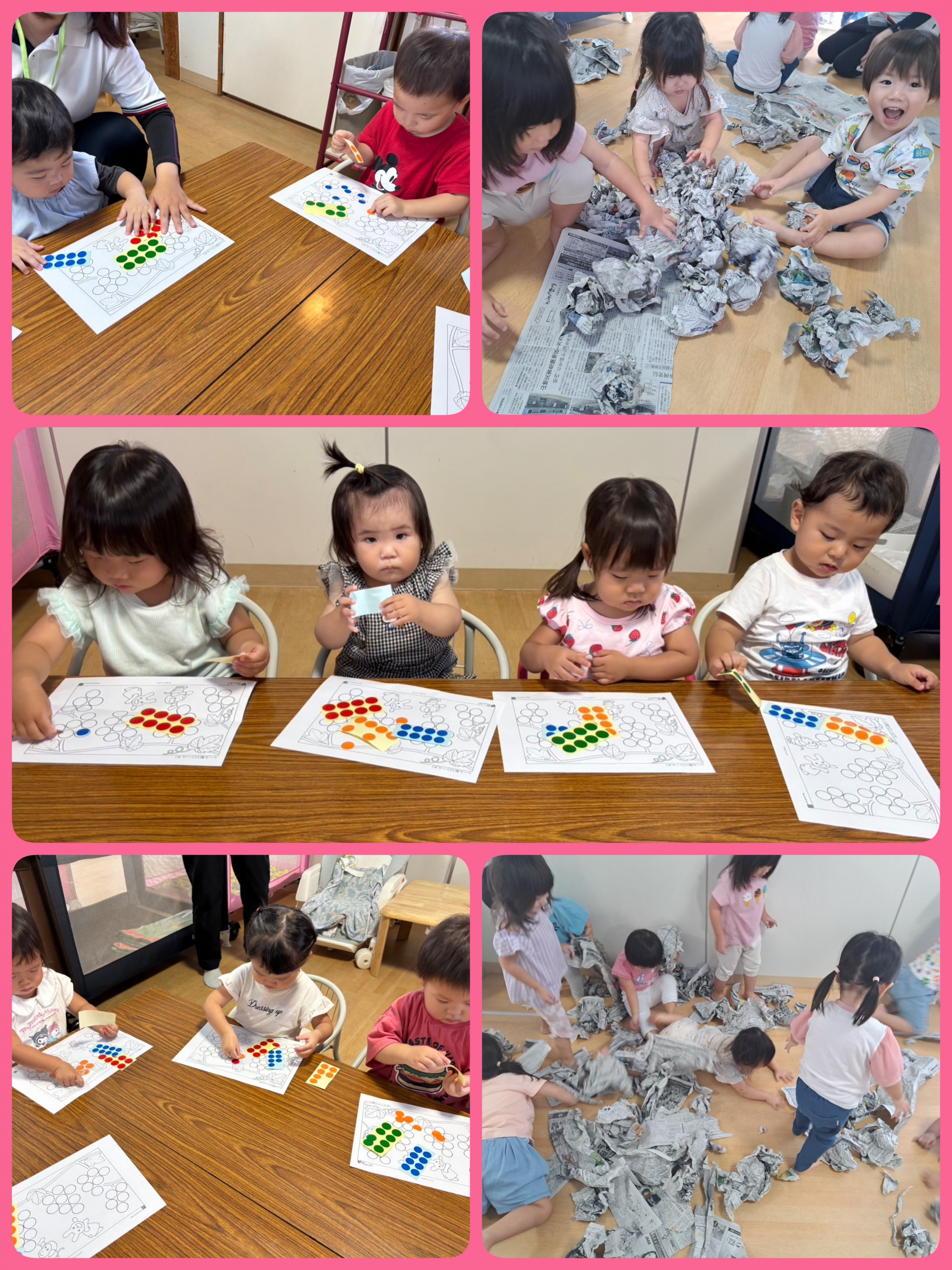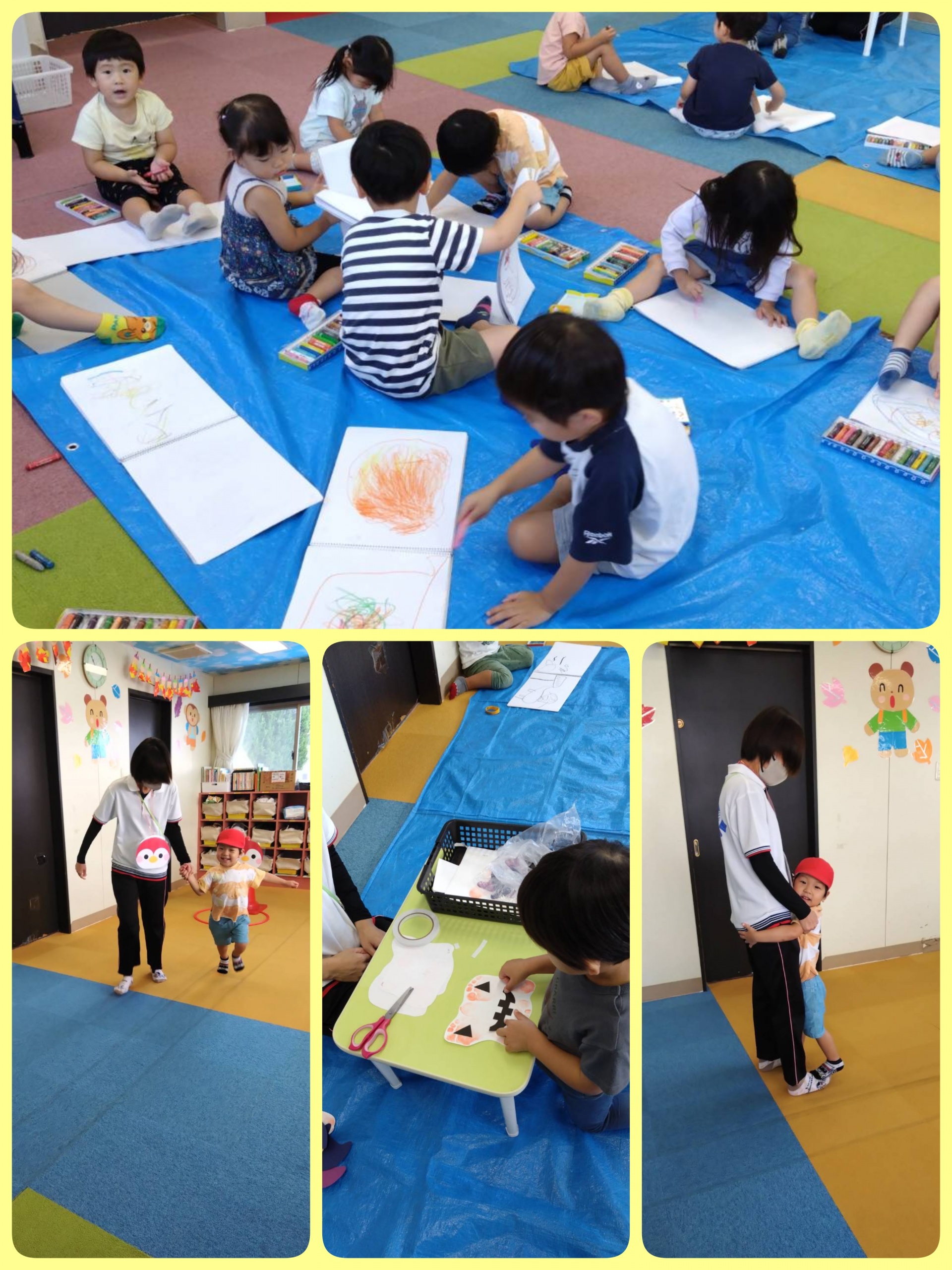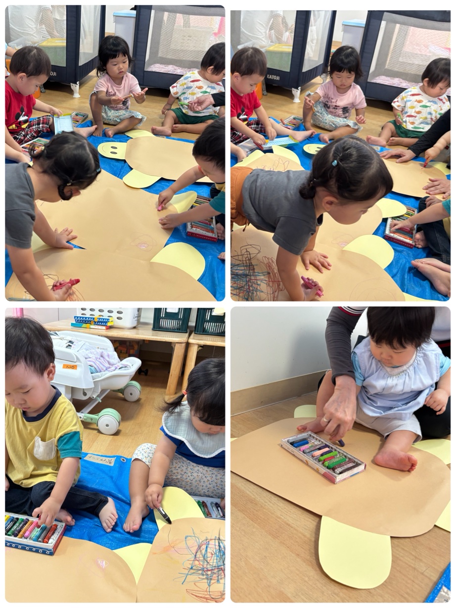 あかさんはお部屋でペアで並んで座る練習や、リズム遊びをしたあと、大きな模造紙にお絵描きしました。