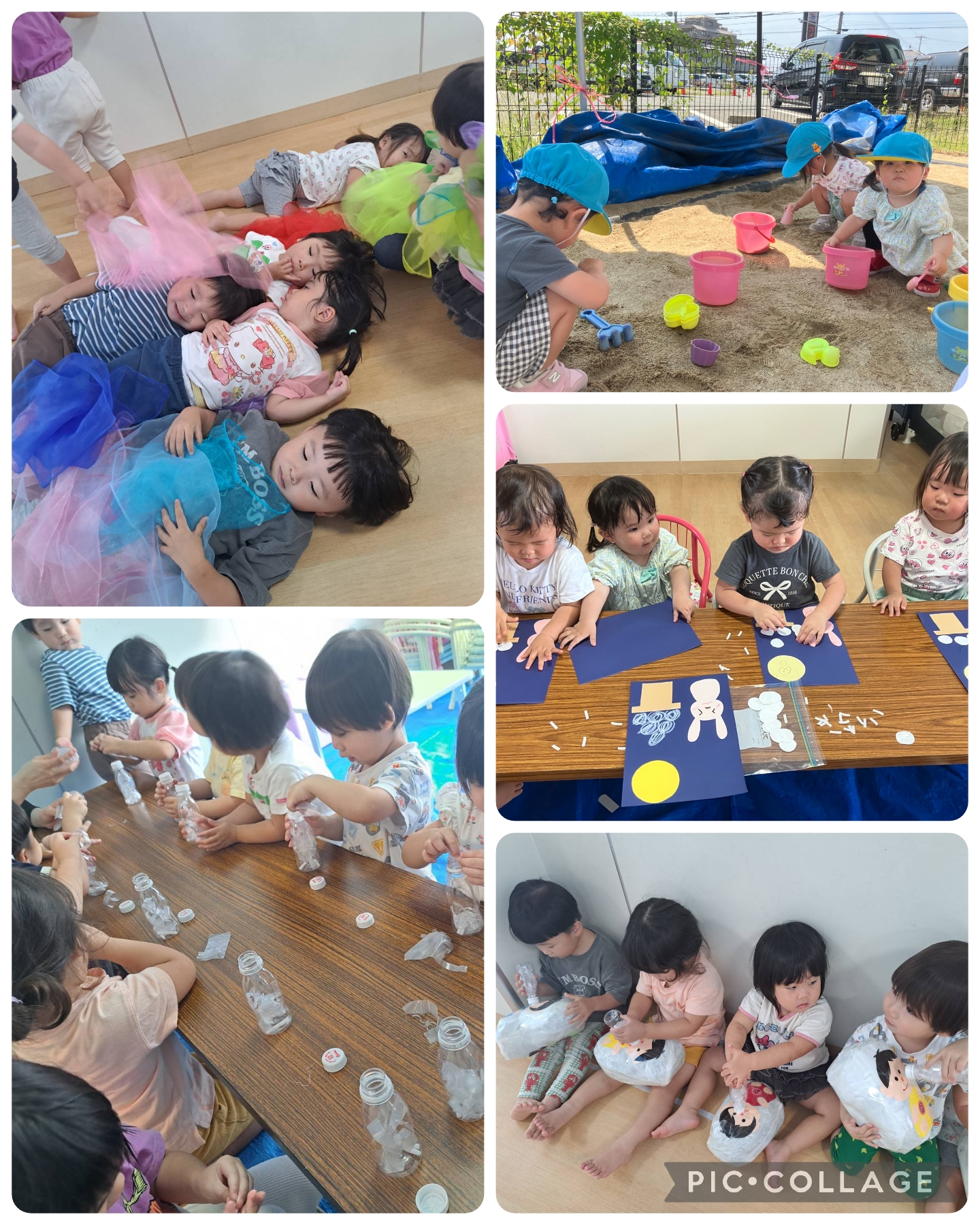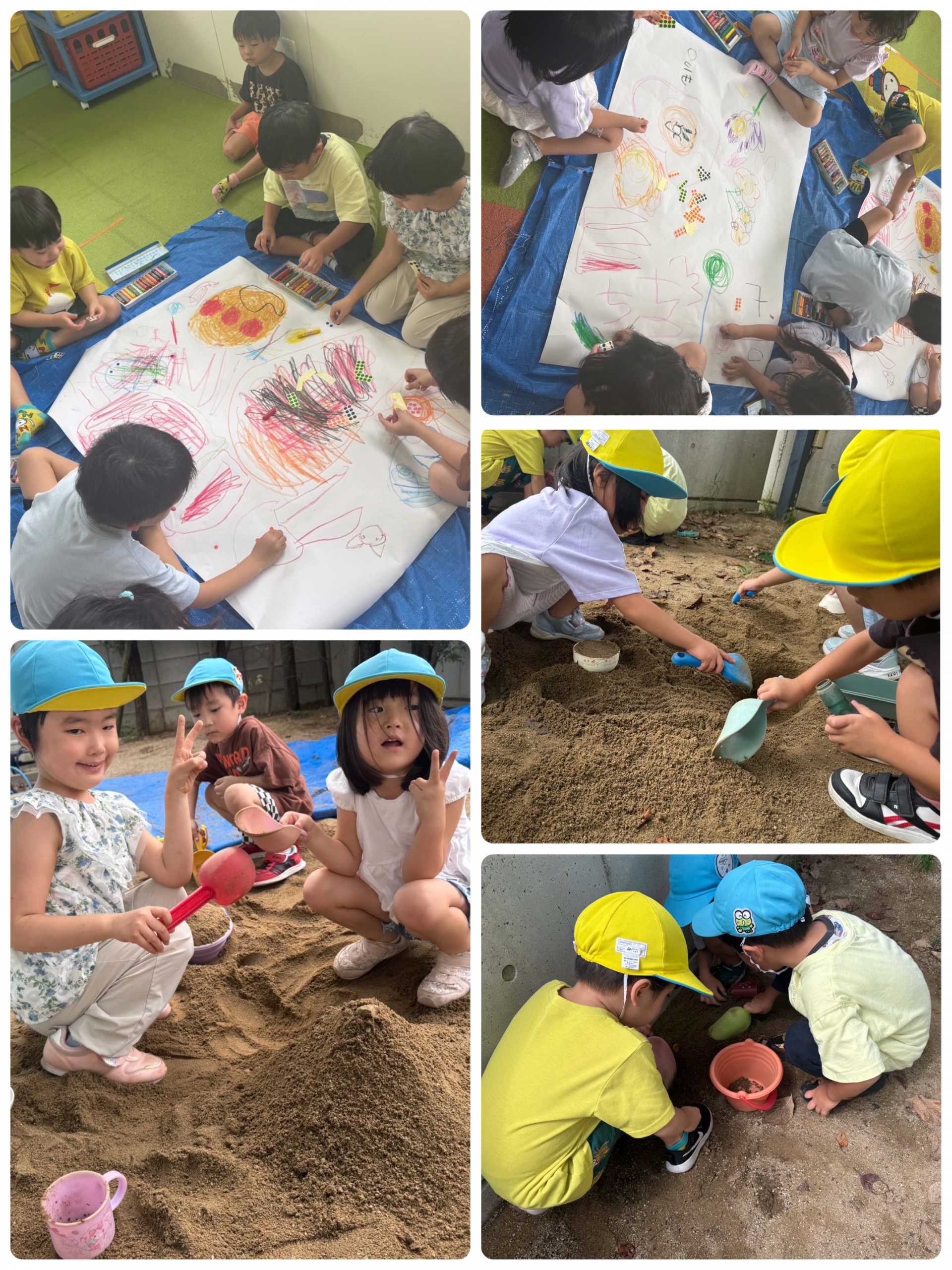 あおくじらさんは大きな模造紙にお絵描きをしたり、お砂場遊びをしたりして楽しみましたよ( ´›ω‹`)