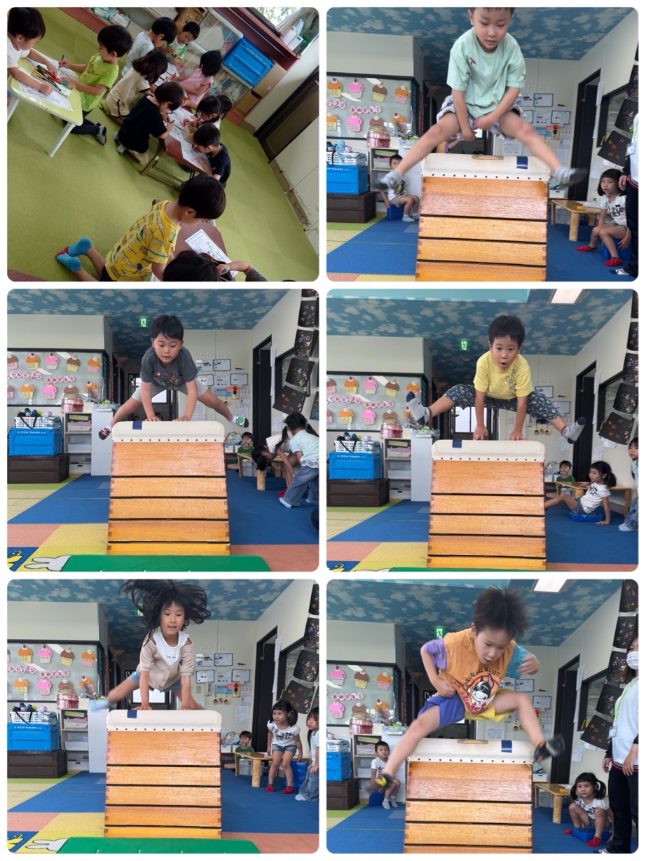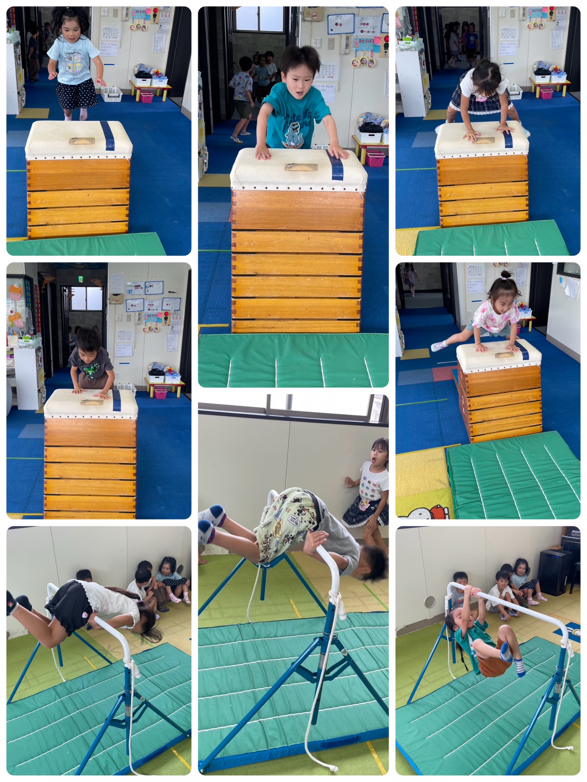 くじらさんは鉄棒や跳び箱、マットを出してサーキット遊びをしました。体をたくさん動かして遊ぶことを楽しんでいますね。