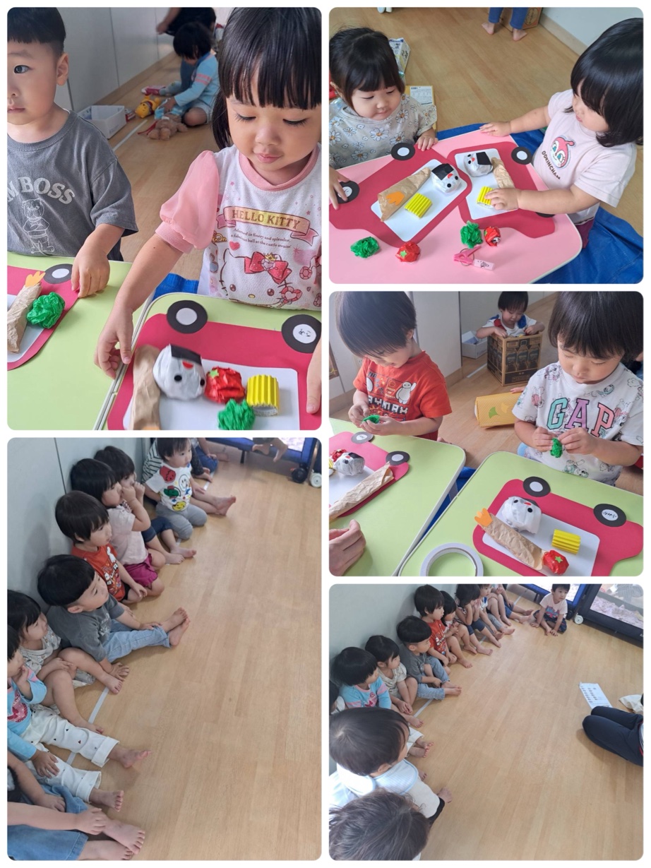 ぴんくぺんぎんさんはお弁当バスのおにぎりやブロッコリー、ミニトマトを作りました。紙をくしゃくしゃ丸めておいしいお弁当になりそうです。そして、今日のお昼は遠足と同じようにシートに座って食べてみましたよ。遠足が楽しみですね。