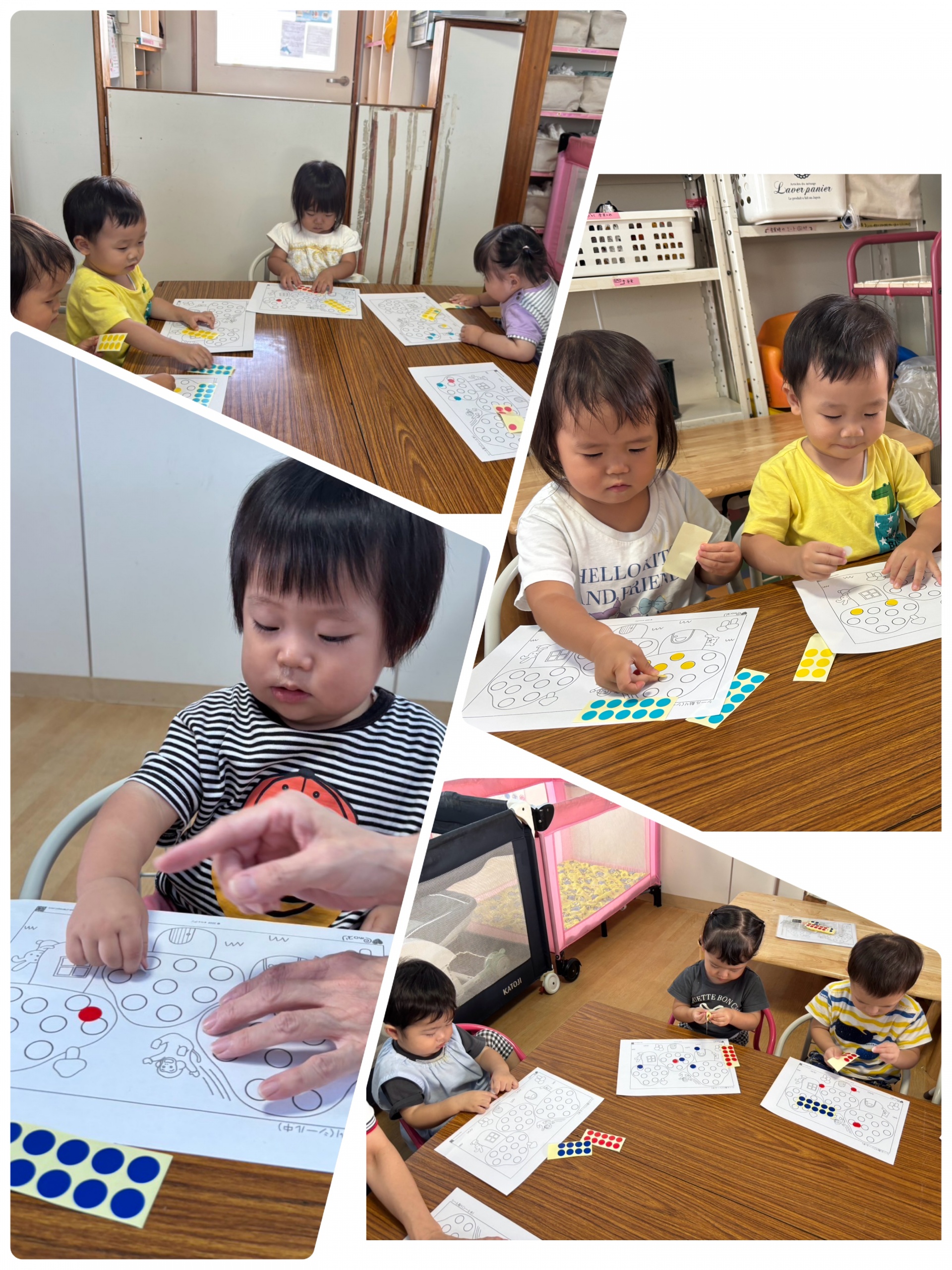 分園ぴんくさんはビー玉を絵の具に浸し、画用紙の上をコロコロ〜としてみました¨̮⃝ どんな作品ができるのか楽しみですね☆