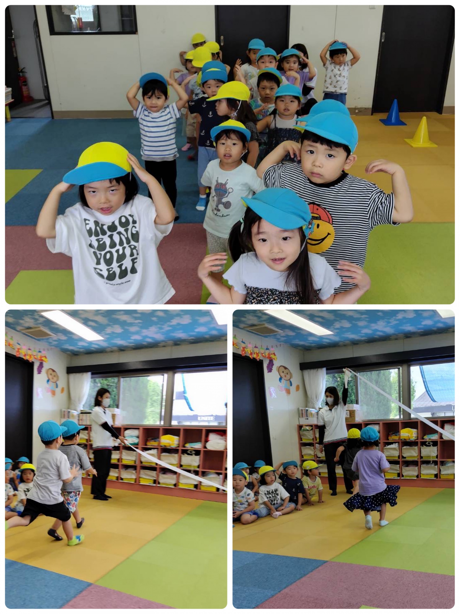みどりさんは縄跳びを使って体を動かしたり、みんなの縄跳びを並べてジャンプしました。