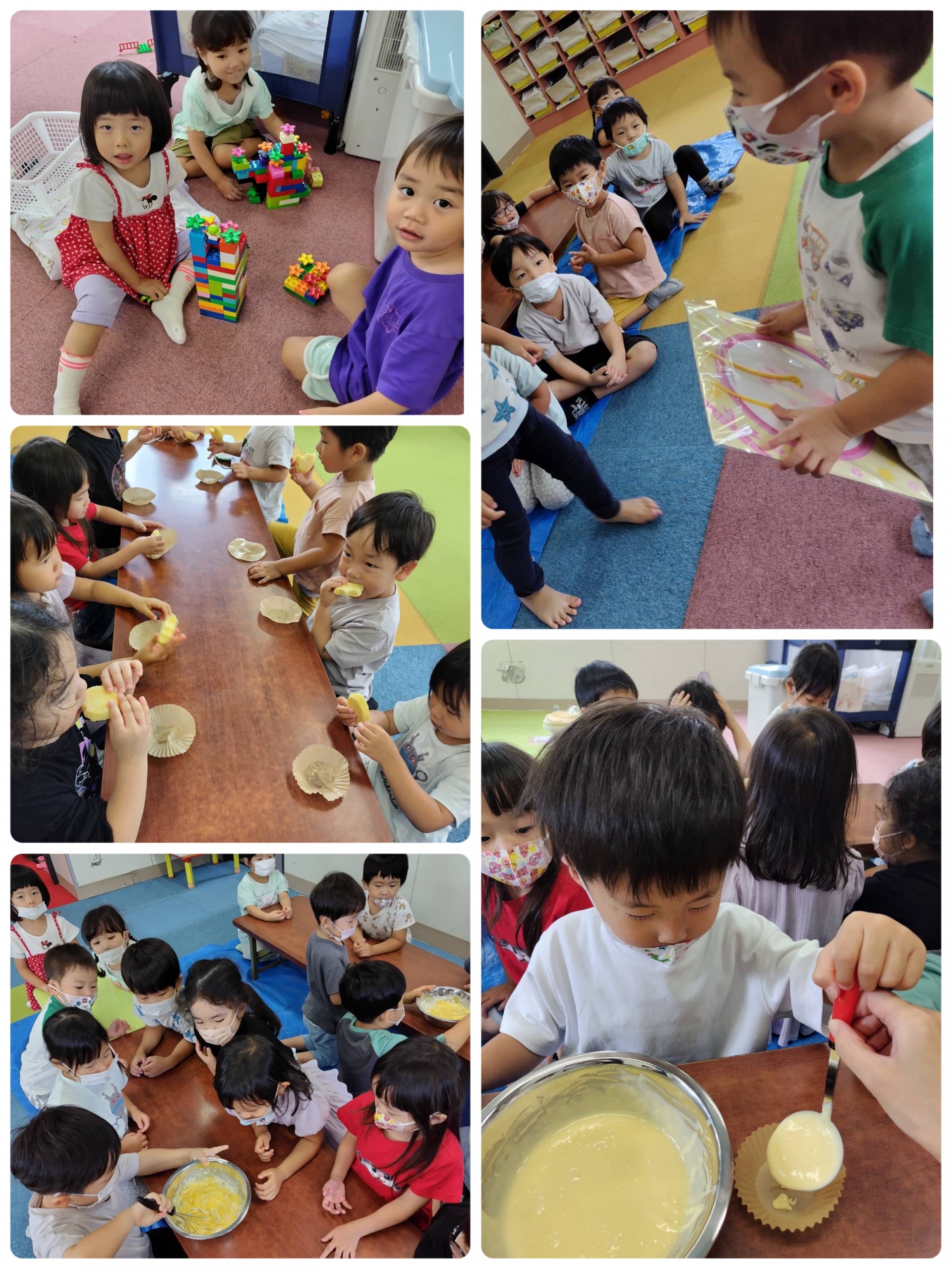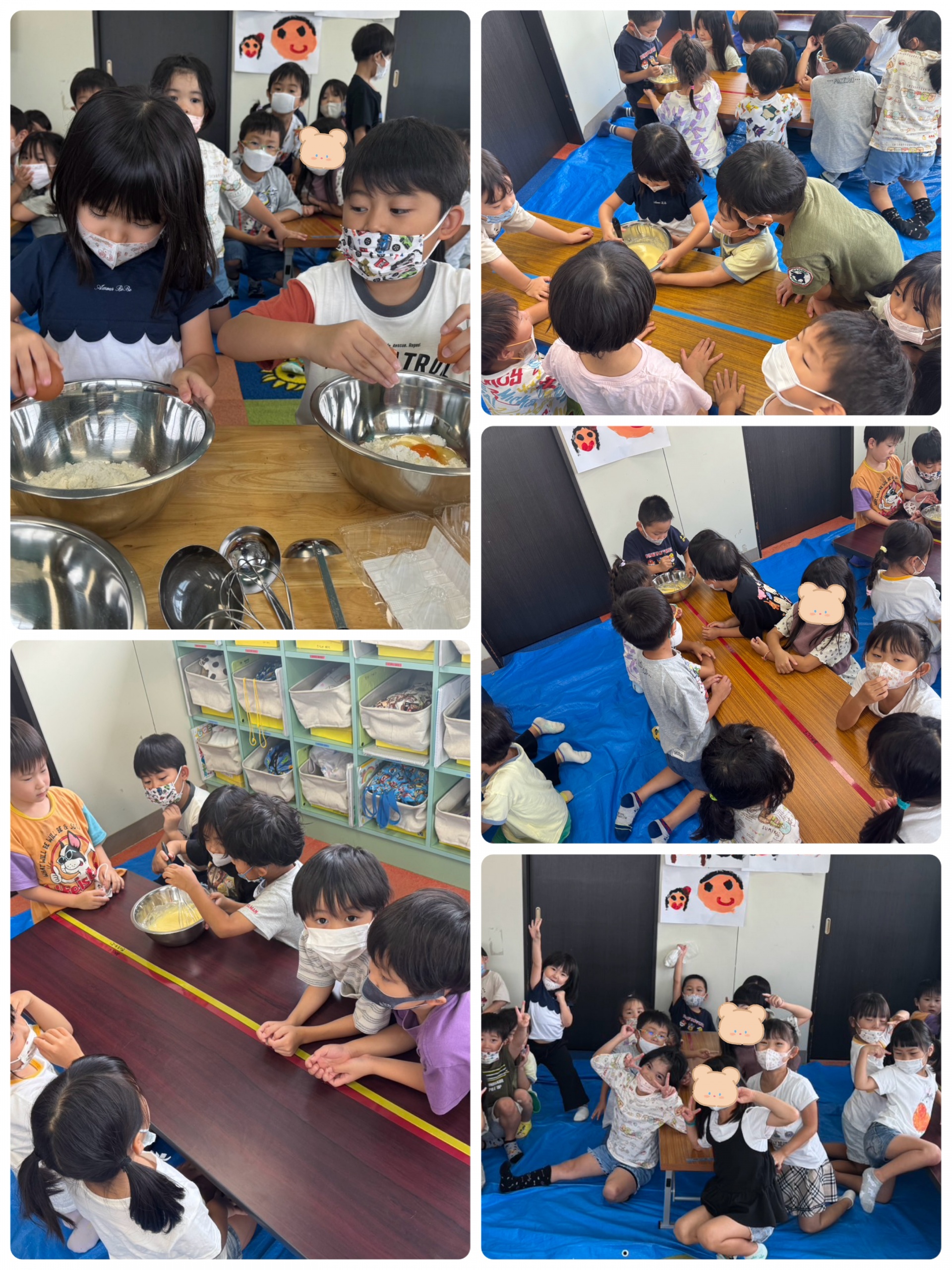 本園さんではくじらさん、きいろさんそれぞれのクラスで蒸しケーキ作りをしました♪