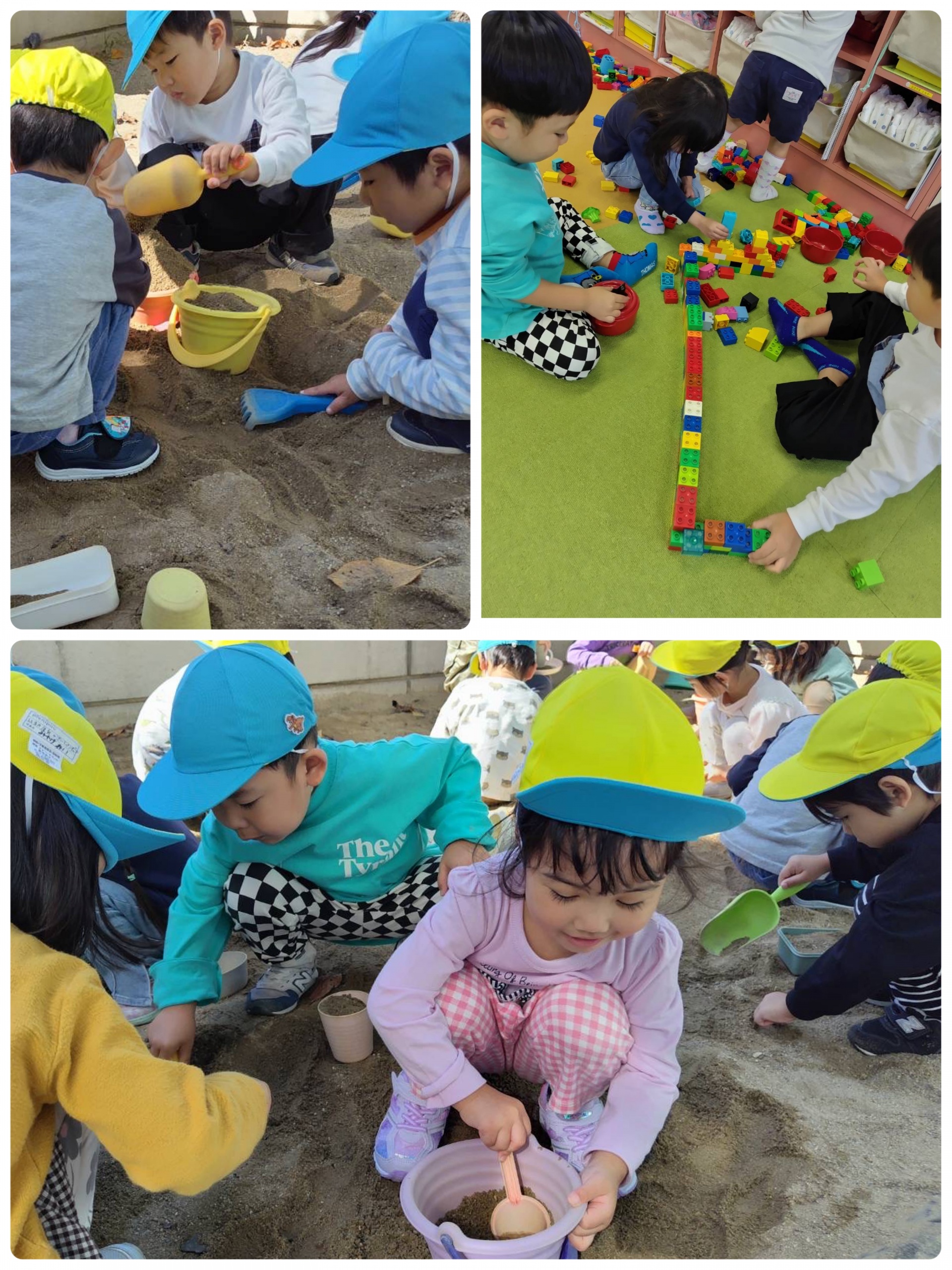 きいろさんは、砂場遊び。思い思いにお料理したり、友達と山を作ったり。友達と一緒に遊ぶ楽しさを感じるようになってきましたよ。