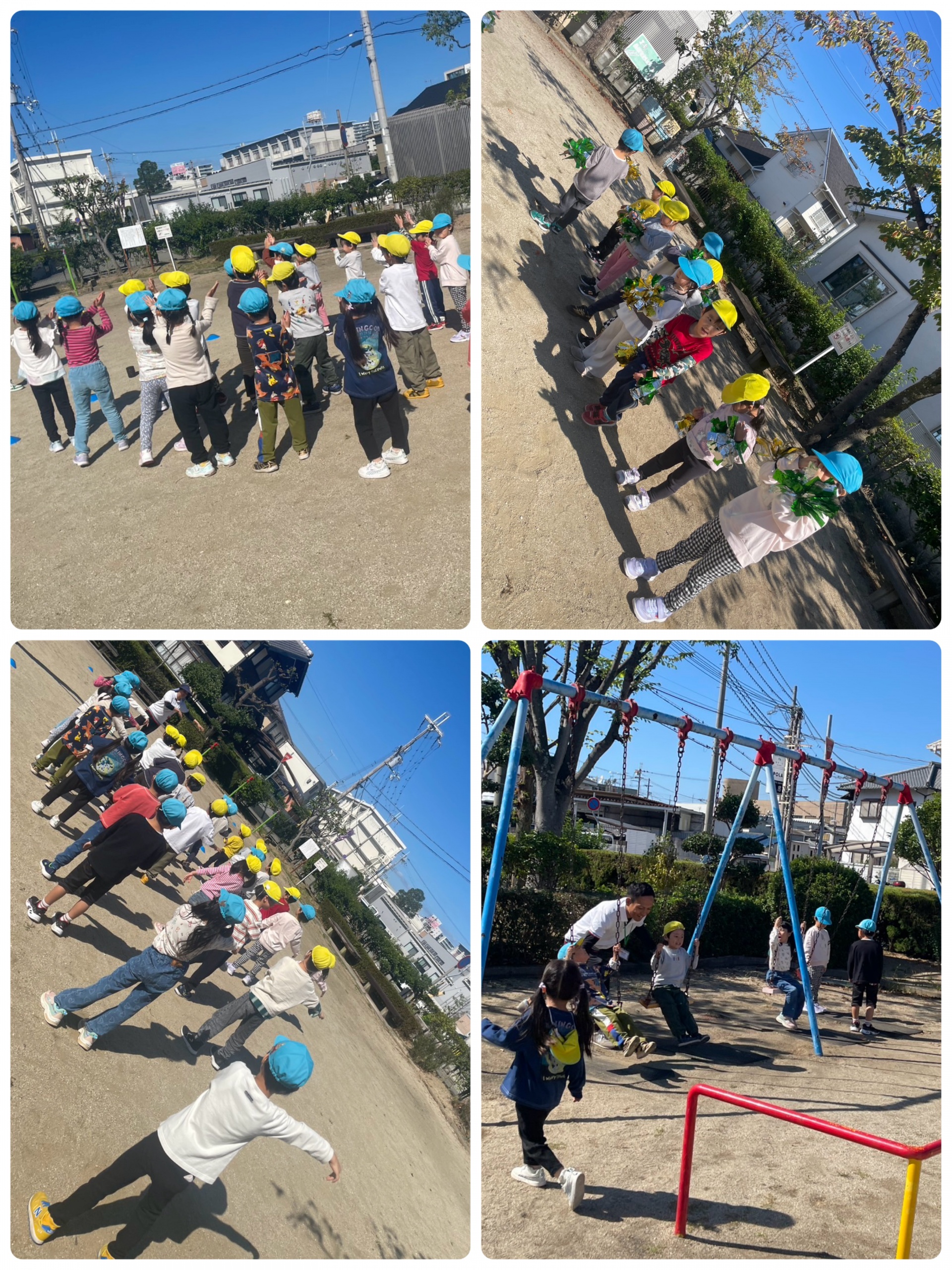 今日は、いい天気の中、くじらさんは公園練習がありました。体操や、ダンスは一つ一つ、動きを確認しながら、友達と振りを揃えようと頑張っています。