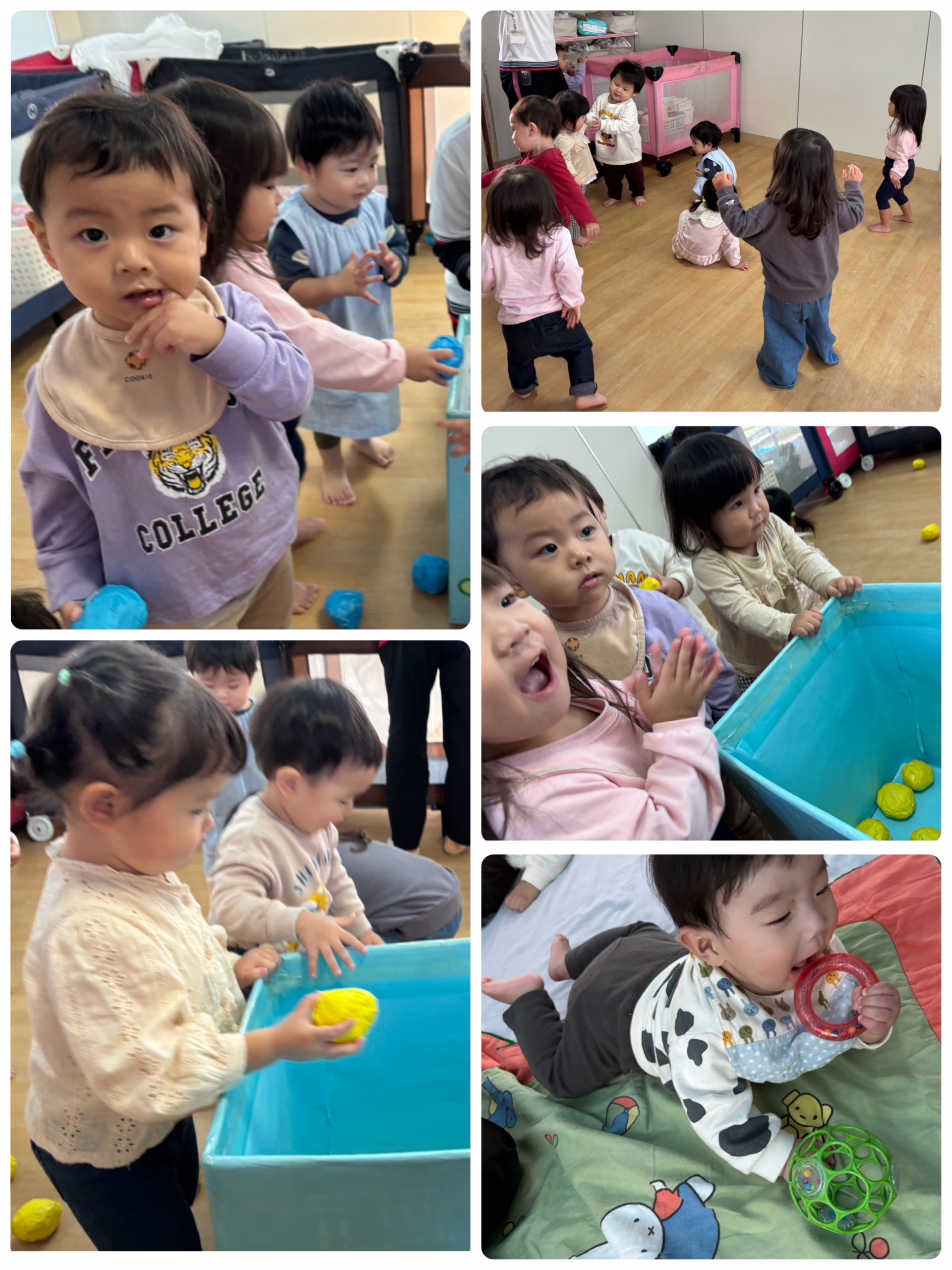 おれんじ、しろ、みどりさんはお部屋で体操や、ひろってポンをしました。箱の中に上手にボールを入れられて、「わ〜!」と嬉しそうに拍手する姿が、とっても可愛いかったですよ。
