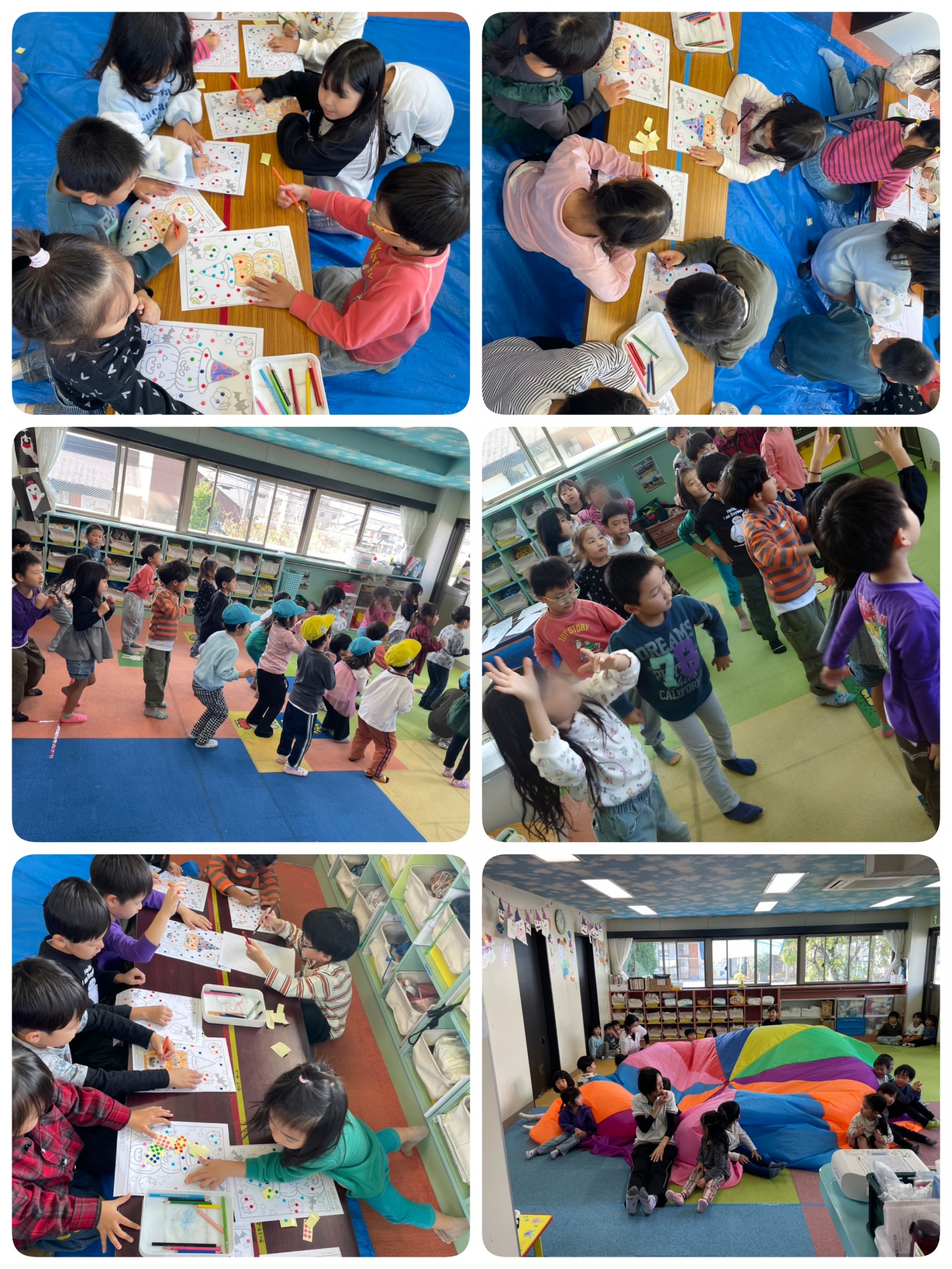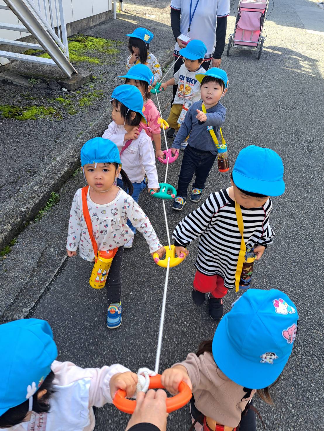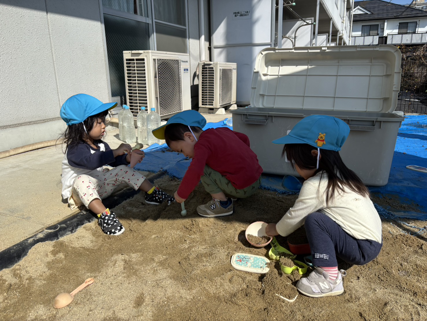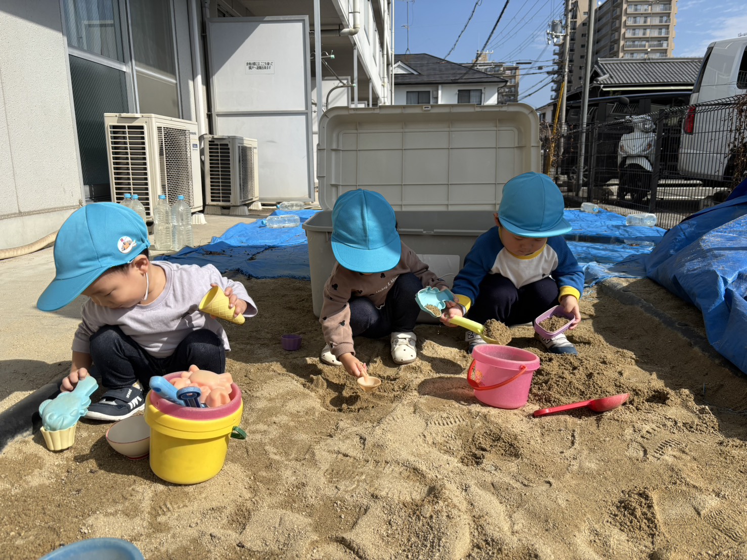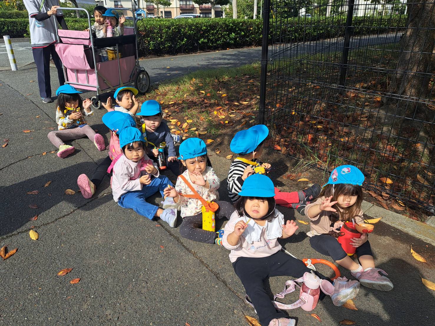 分園さんはクラスにわかれて活動、おれんじさんとしろさんは砂場、ぴんくさんはお散歩に出かけました。